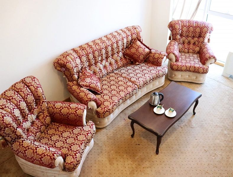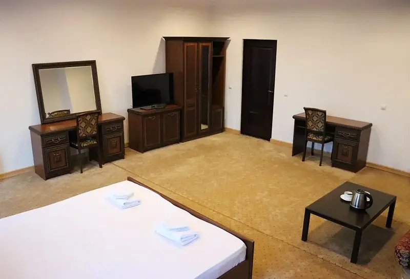 Жилая комната с большой кроватью и гостиная вряд ли оставят равнодушными. Удобный диван, два кресла и стол для семейных посиделок. Холодильник сохранит Ваши продукты, фен поможет высушить волосы, большое зеркало незаменимо для девушек.