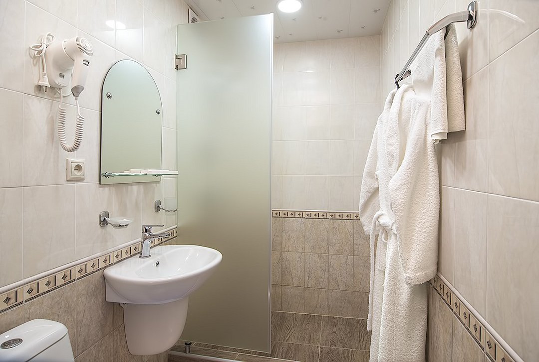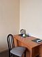 Wi-Fi, телефон, светильник, настольные лампы, фен, банные полотенца, полутораспальная кровать, стулья, шкаф для одежды, письменный стол, зеркало, чайник, унитаз, раковина, душ, кулер на этаже, вид во двор, туалетные средства, туалет, телевизор с плоским экраном, мини-холодильникВ номере
