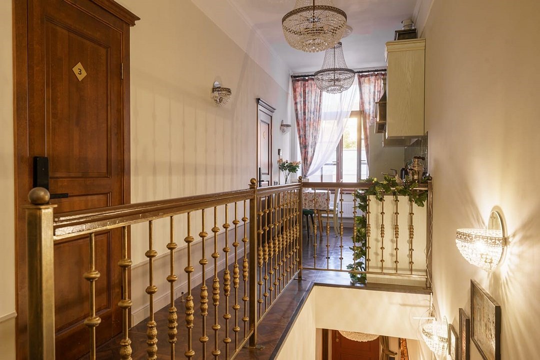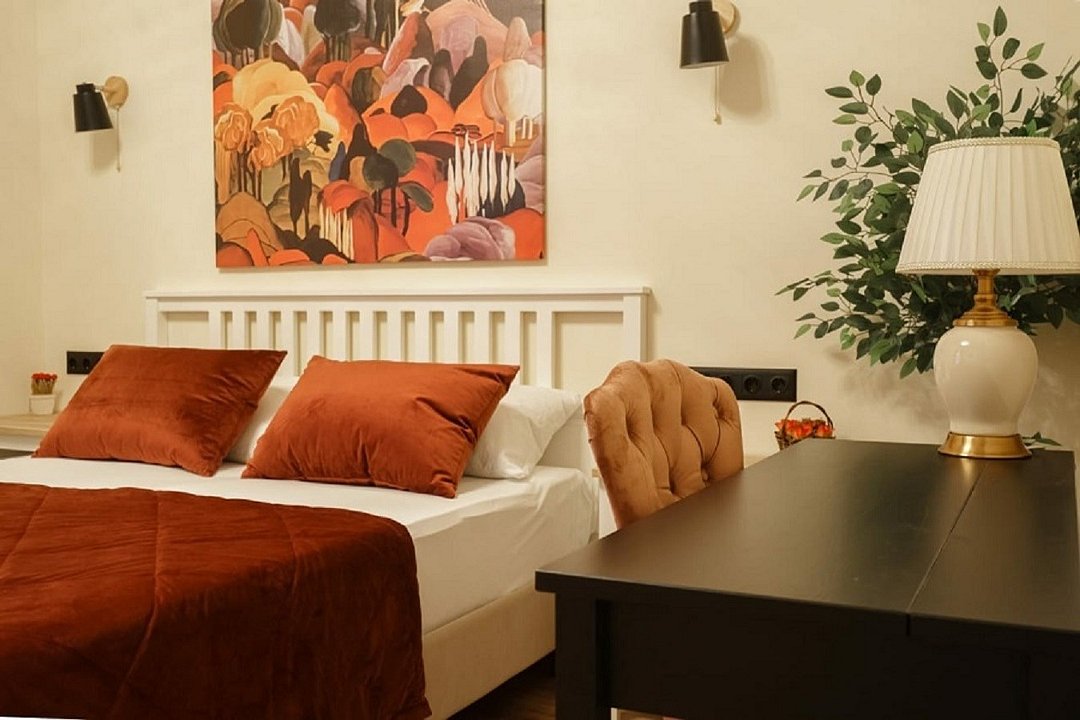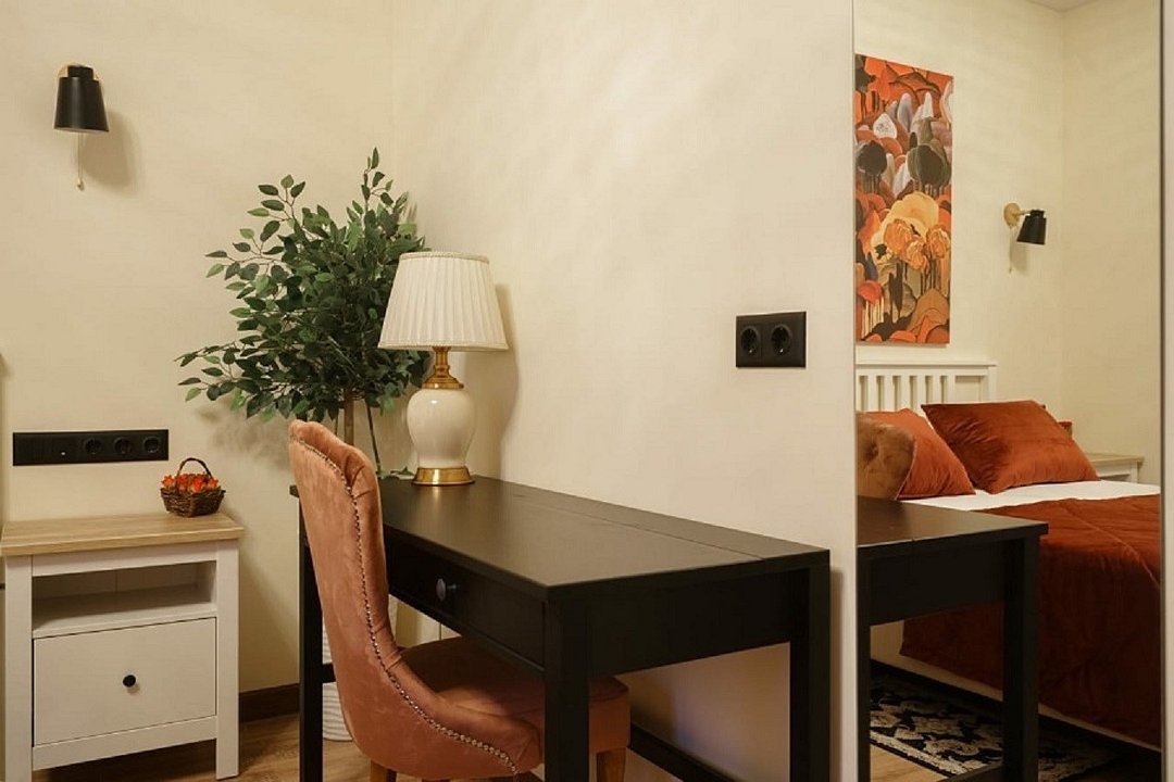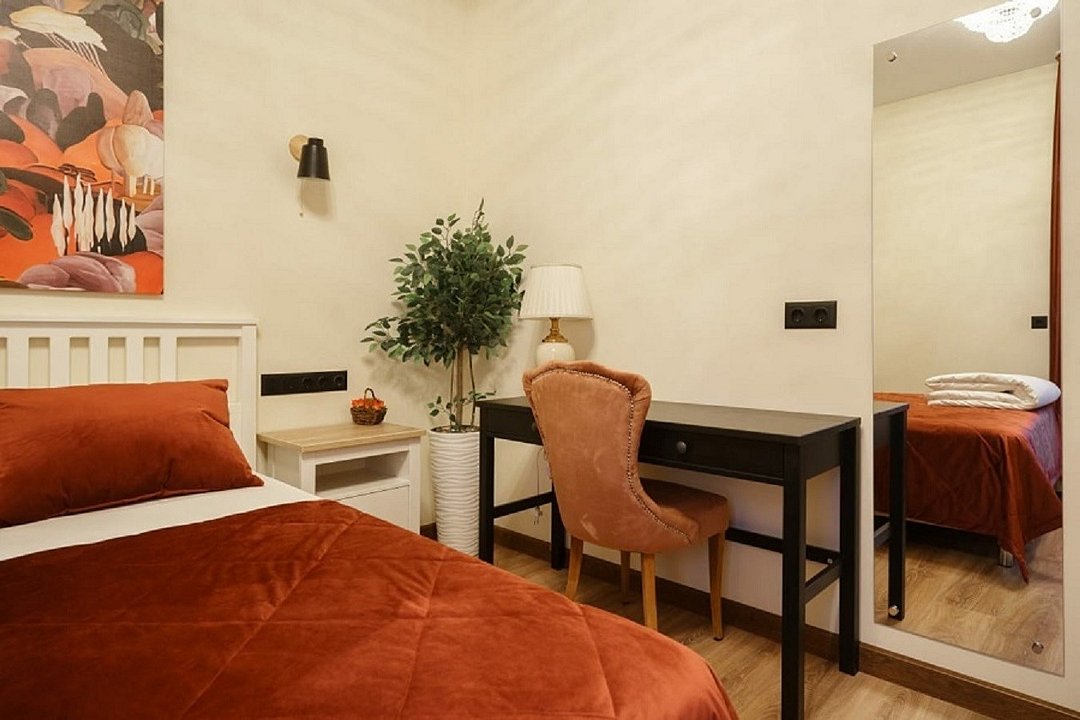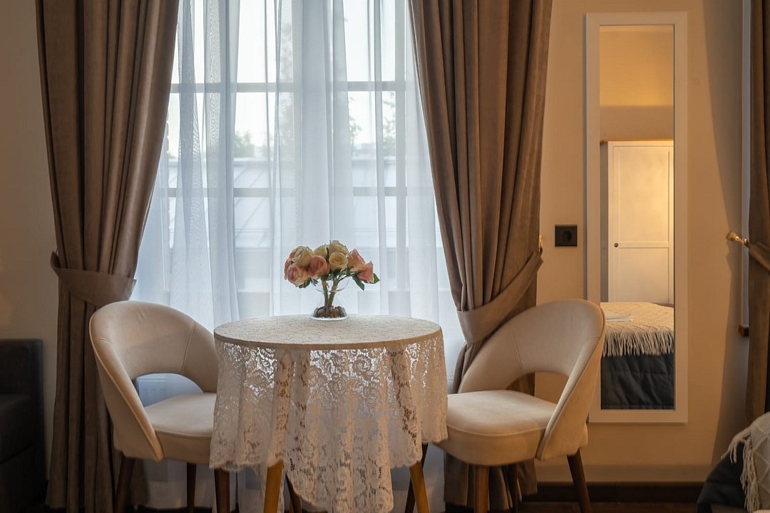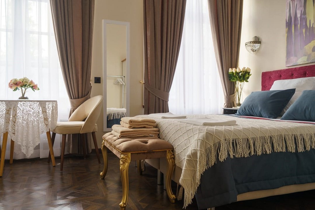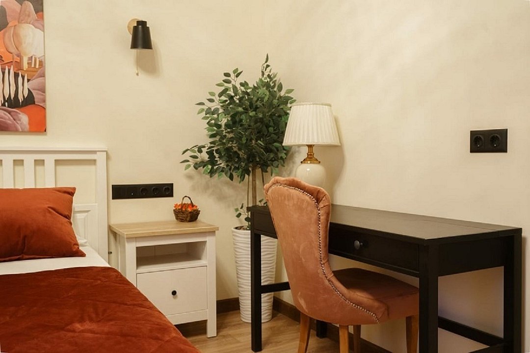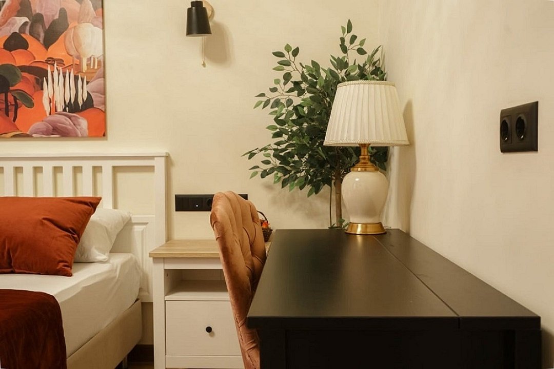 Wi-Fi, интернет, светильник, фен, электронные замки, душевая кабина, банные полотенца, две односпальные или большая двуспальная кровать, тумбы, стулья, шкаф для одежды, раковина, вид во двор, стол, туалет, телевизор со Smart TV, номер для некурящих, пуфик, система умный дом, два раскладных кресла, уборка номера, вешалки-плечики, частный двор, мыло, зеркало в полный ростВ номере