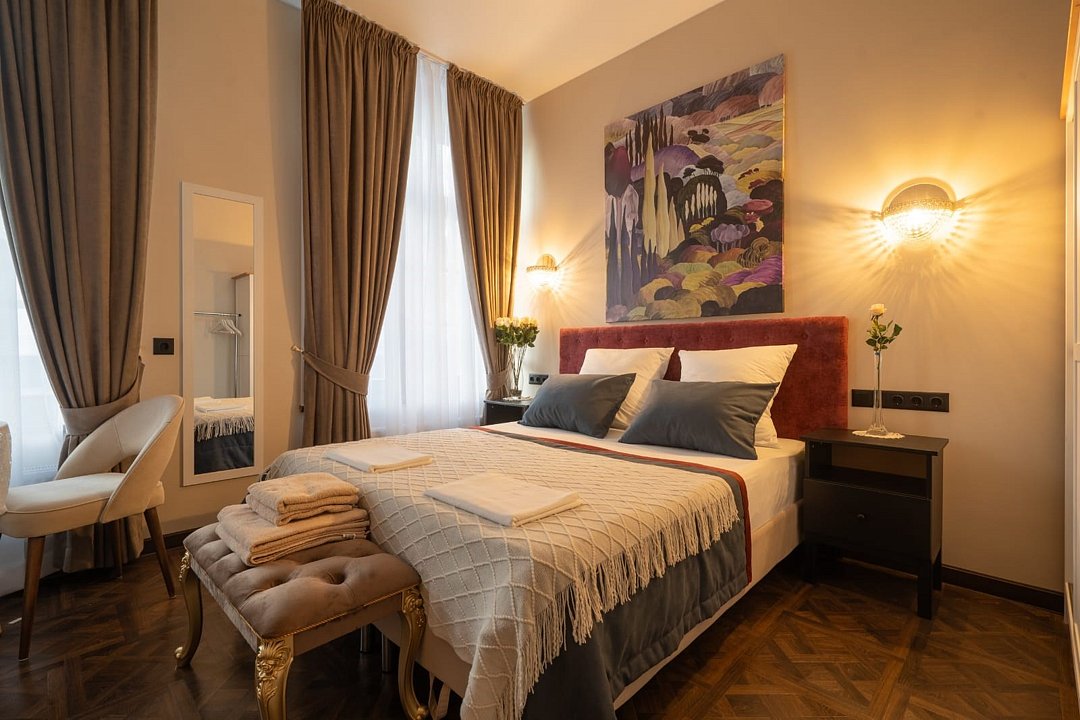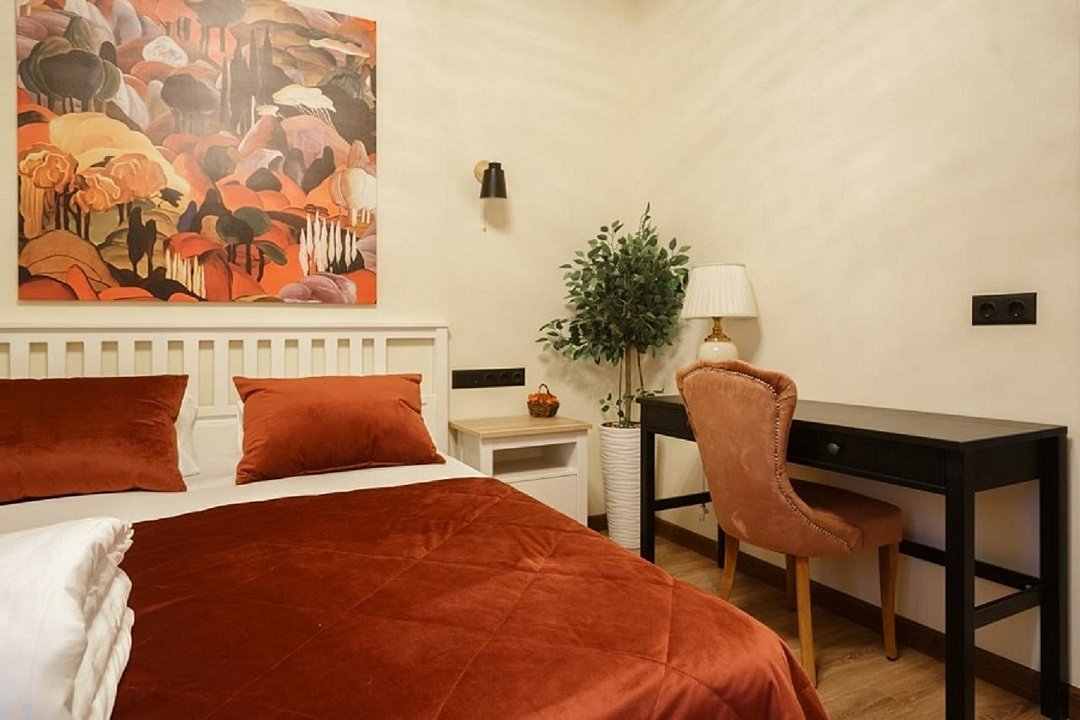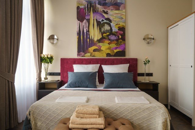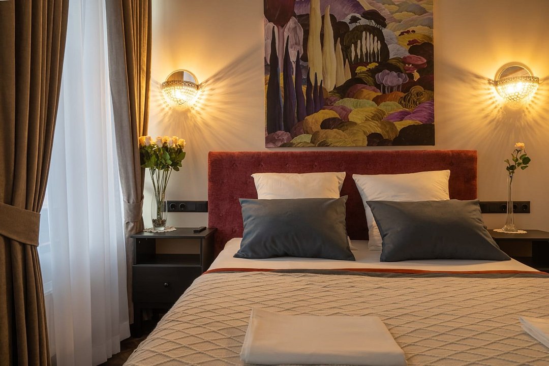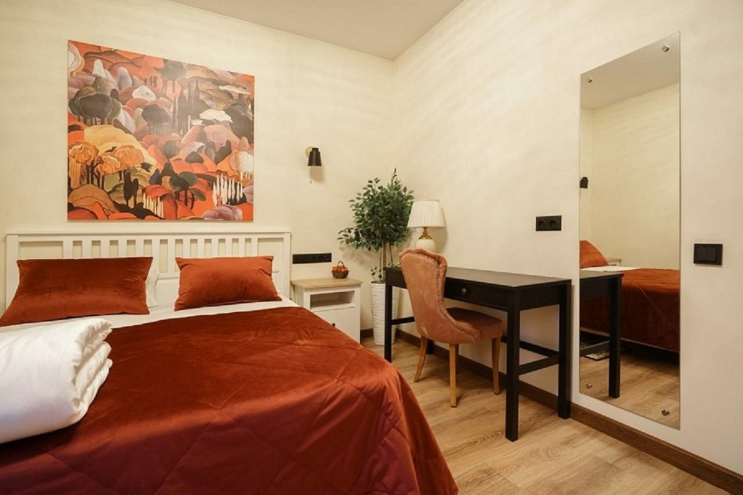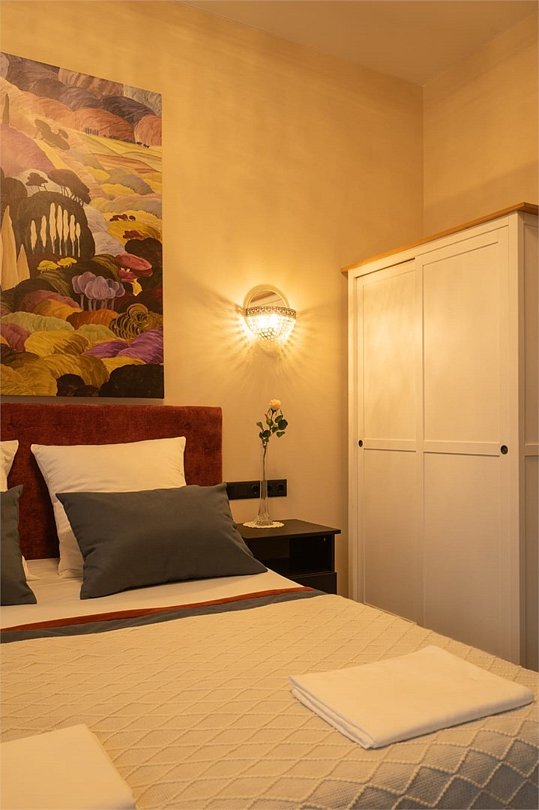 Wi-Fi, интернет, электронные замки, душевая кабина, две односпальные или большая двуспальная кровать, унитаз, раковина, вид во двор, телевизор со Smart TV, система умный дом, мыло, вид на достопримечательностьВ номере