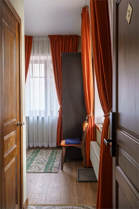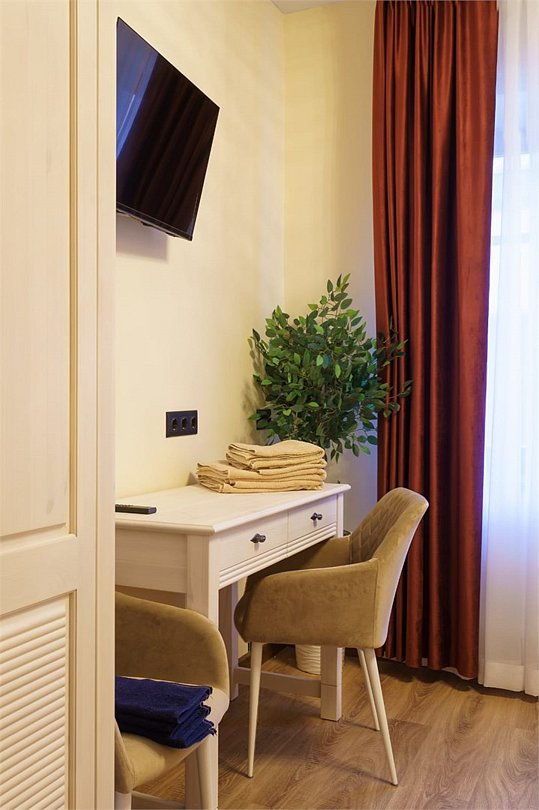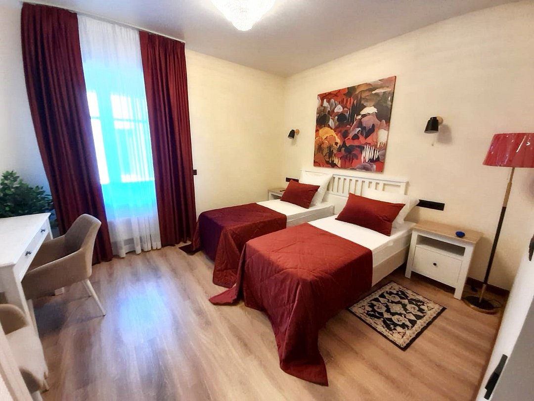 Wi-Fi, интернет, электронные замки, душевая кабина, банные полотенца, две односпальные кровати, стулья, шкаф для одежды, унитаз, раковина, вид во двор, гостиничная парфюмерия, телевизор со Smart TV, система умный дом, уборка номера, мыло, зеркало в полный рост, вид на достопримечательностьВ номере