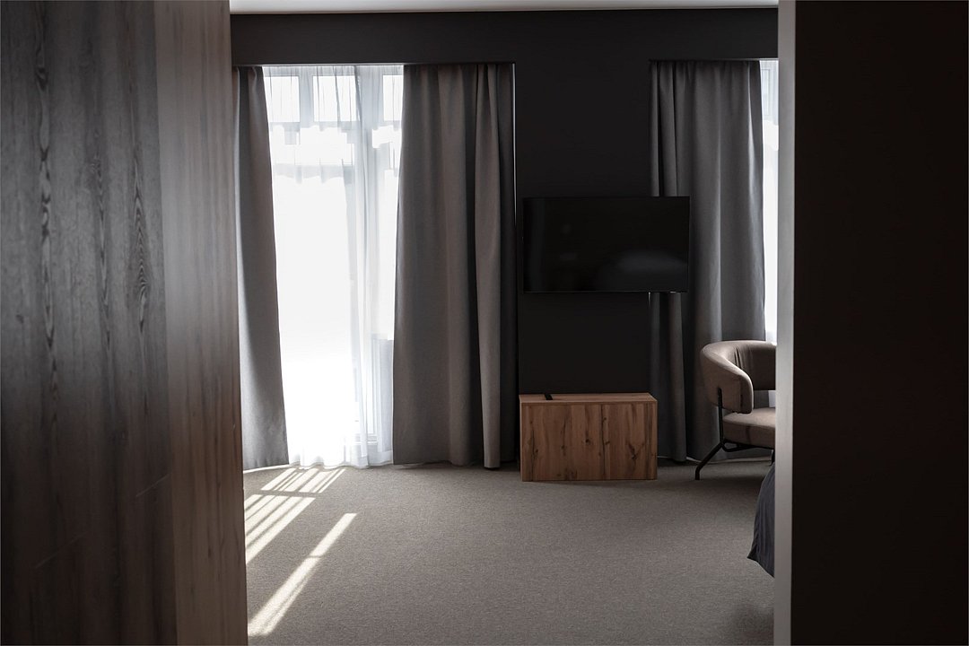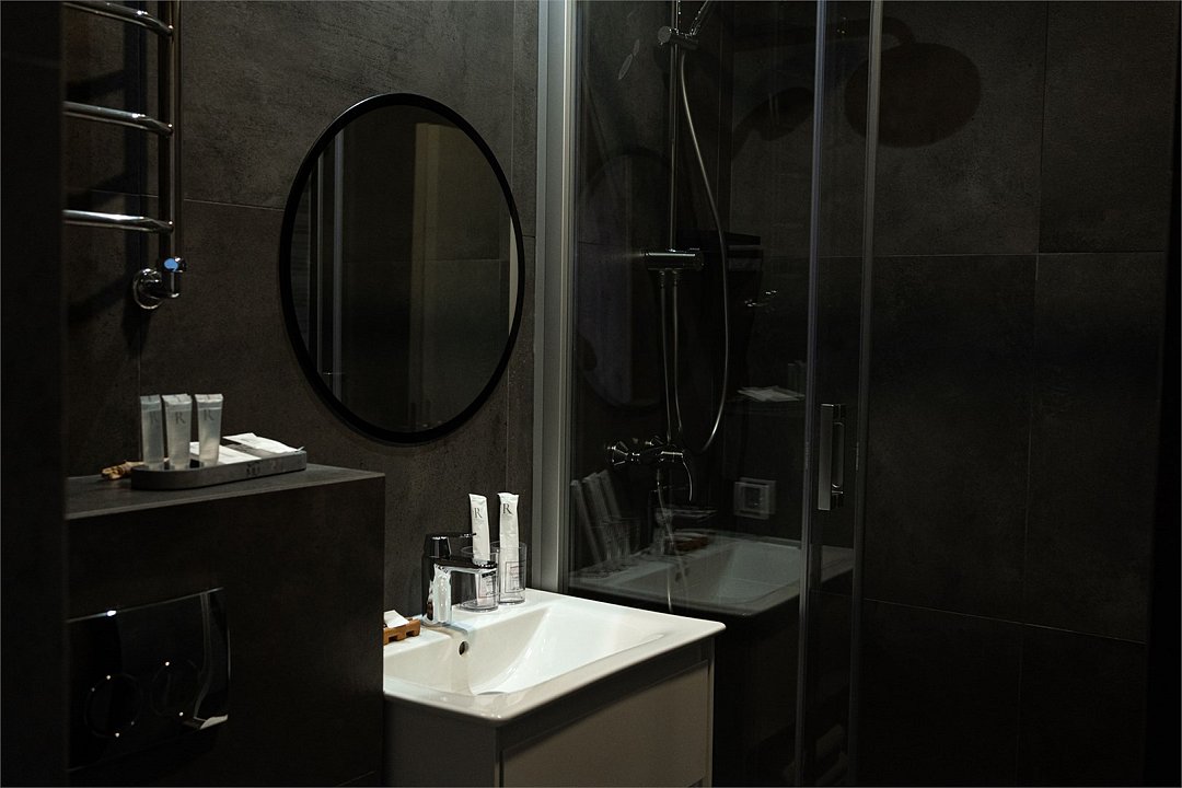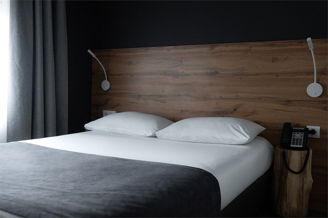 Двухместный номер с одной двуспальной кроватью. В номере есть собственный санузел, ТВ, чайник, минибар, фен. Гигиенические принадлежности, тапочки, чай, кофе, сахар, вода - входят в стоимость номера. Минибар - за доп.плату. Отличительная особенность данного номера от категории Комфорт - наличие лаундж зоны.Услуги и удобства