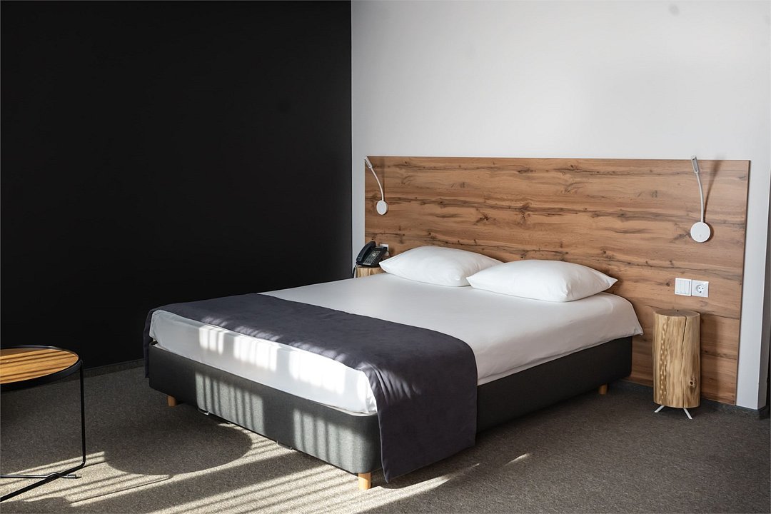 Двухместный номер с одной двуспальной кроватью площадью от 30 до 35 кв.м. В номере есть собственный санузел, ТВ, чайник, минибар, фен. Гигиенические принадлежности, тапочки, чай, кофе, сахар, вода - входят в стоимость номера. Минибар - за доп.плату.Услуги и удобства
