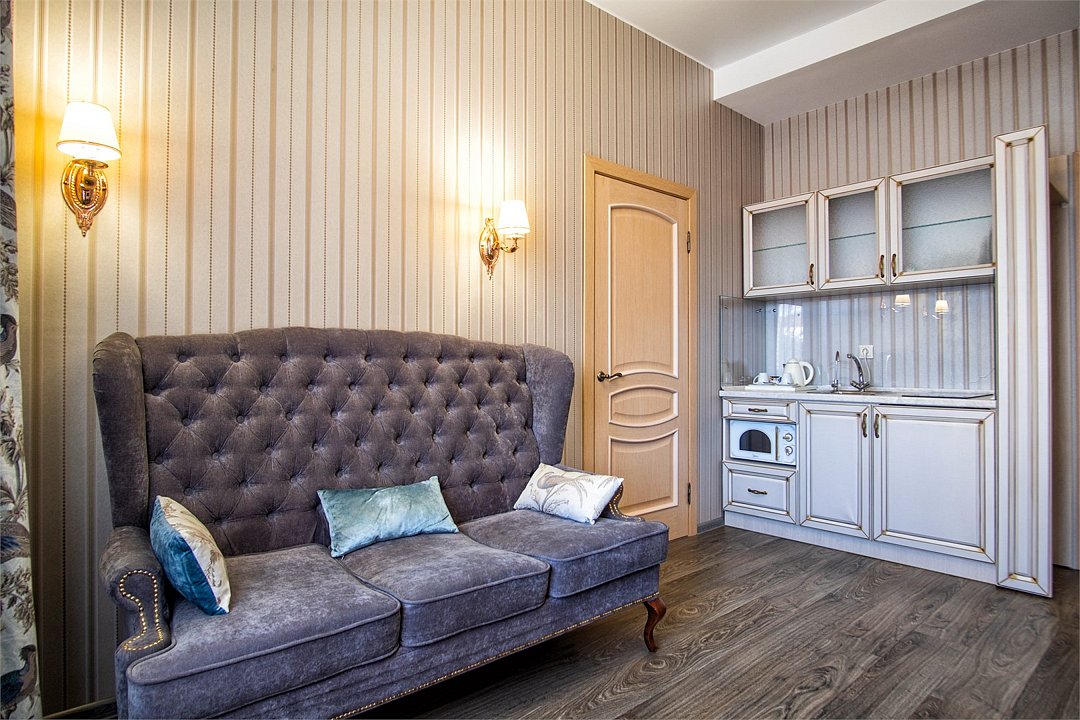 два телевизора, спутниковое телевидение, Wi-Fi, кондиционер, фен, плита для приготовления пищи, микроволновая печь, душевая кабина, халаты, банные полотенца, тапочки, гигиенические средства, двуспальная кровать, диван, шкаф для одежды, вешалки, журнальный столик, зеркало, две комнаты, чайный набор, набор посуды, унитаз, раковина, питьевая вода, ламинат, кухонная посуда, столовые приборы, туалетный столик, туалетные средства, туалет, внутренний телефон, мини-холодильник, мини-кухня, москитная сетка, пуфик, чайная станцияВ номере
