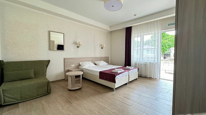 В номере имеется все необходимое для приятного отдыха: две удобные односпальные кровати, двухъярусная кровать, небольшой рабочий стол, шкаф для хранения вещей, холодильник, кондиционер и конечно же оборудованная ванная комната. Номер обеспечивает все условия для отдыха и работы.