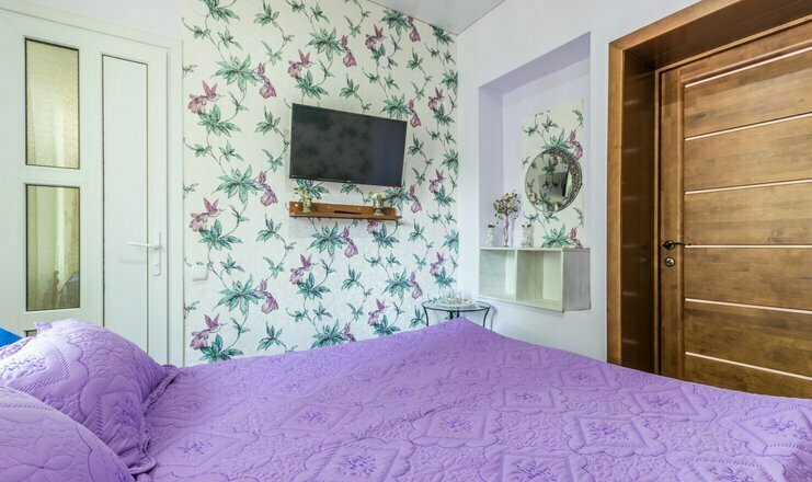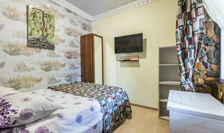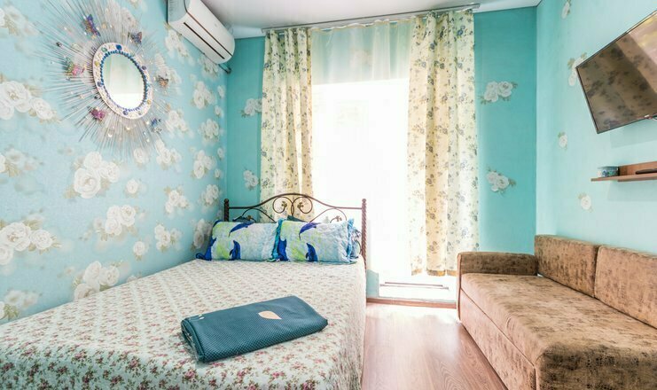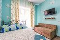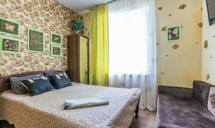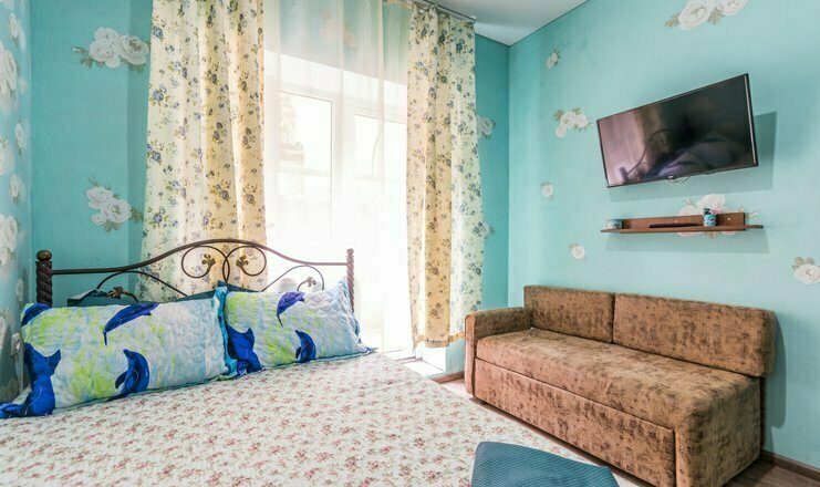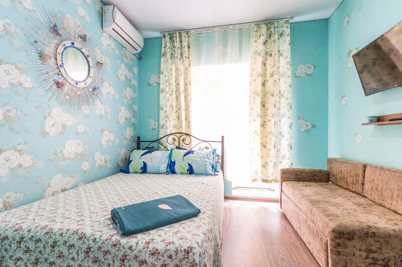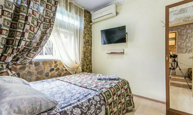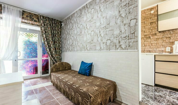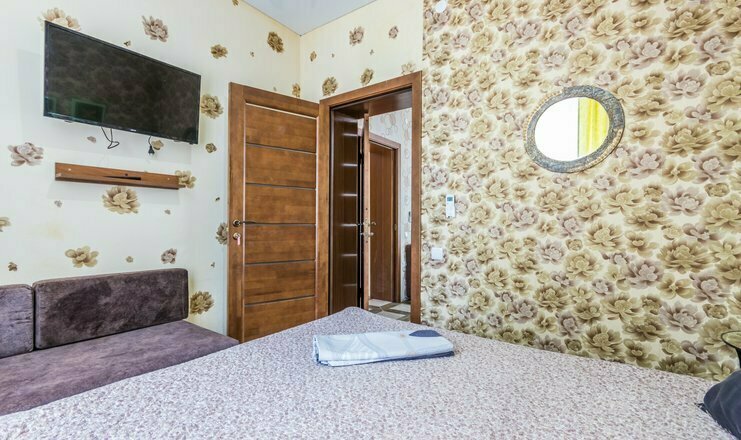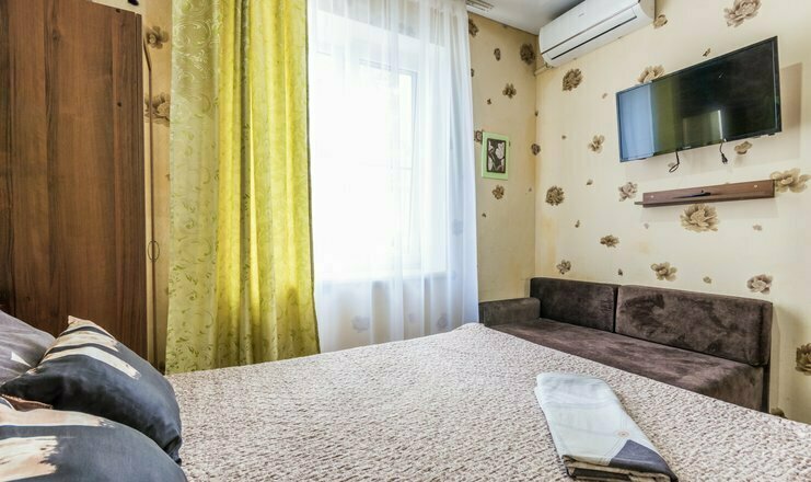 Однокомнатный номер. Двуспальная кровать, односпальный диван, кушетка, телевизор, кондиционер, холодильник, зеркало, столик, душ и туалет, тумбочка.
