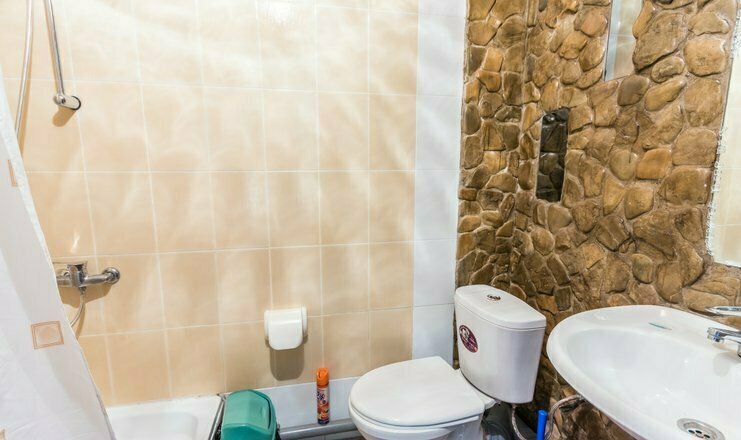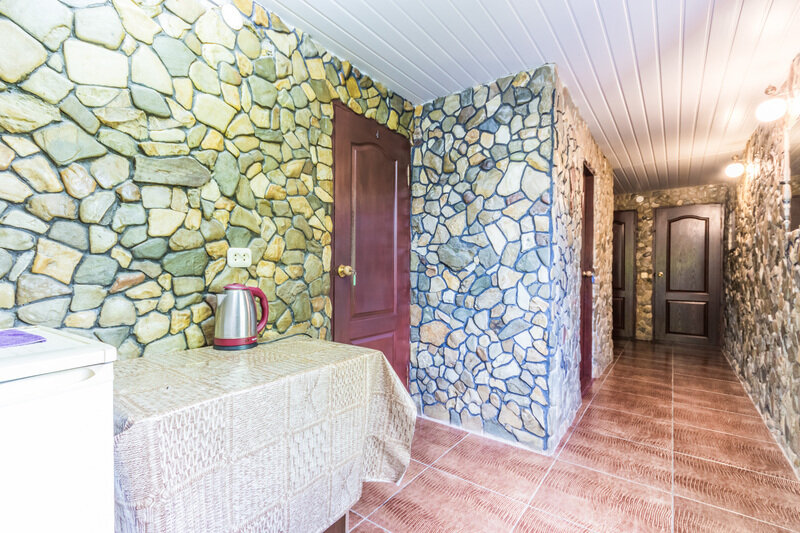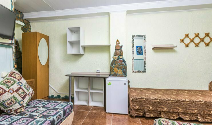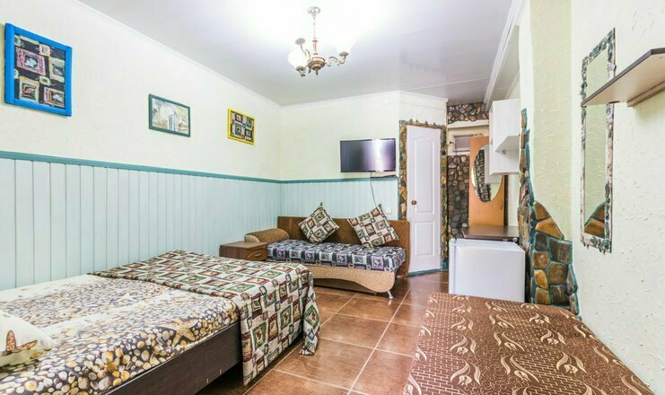 Однокомнатный номер. Двуспальная кровать и двуспальный диван, кондиционер, зеркало, тумбочка, душ и туалет в номере, телевизор, столик. Холодильник на 3 номера, полотенца кроме пляжных