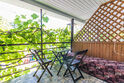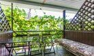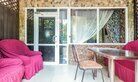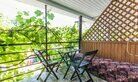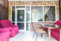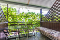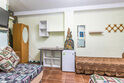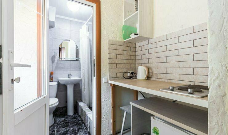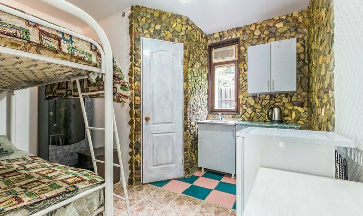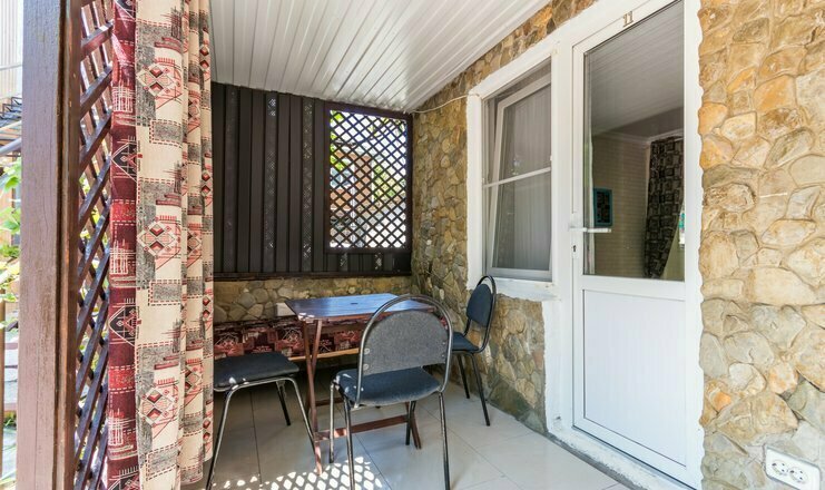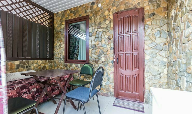 Однокомнатный номер. Двуспальная кровать, двухъярусная кровать, кондиционер, телевизор, душ и туалет в номере, кухня, чайник, варочная панель 2 комфорки, холодильник, полотенца кроме пляжных. Есть своя терраса, там стоит стол со стульями и кушетка для отд