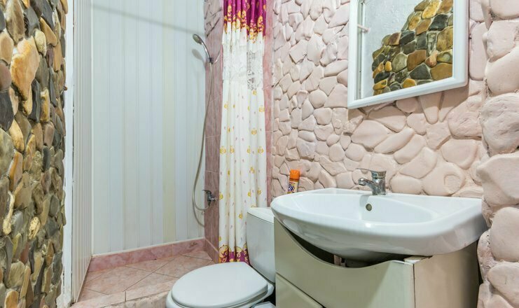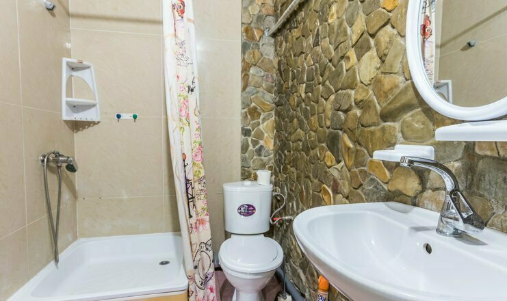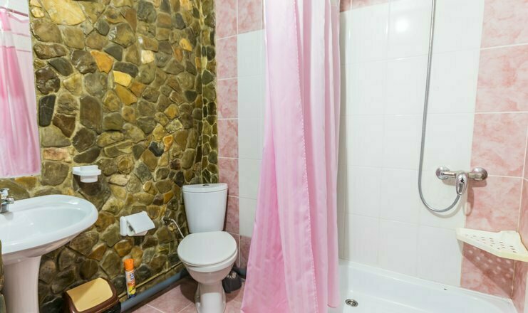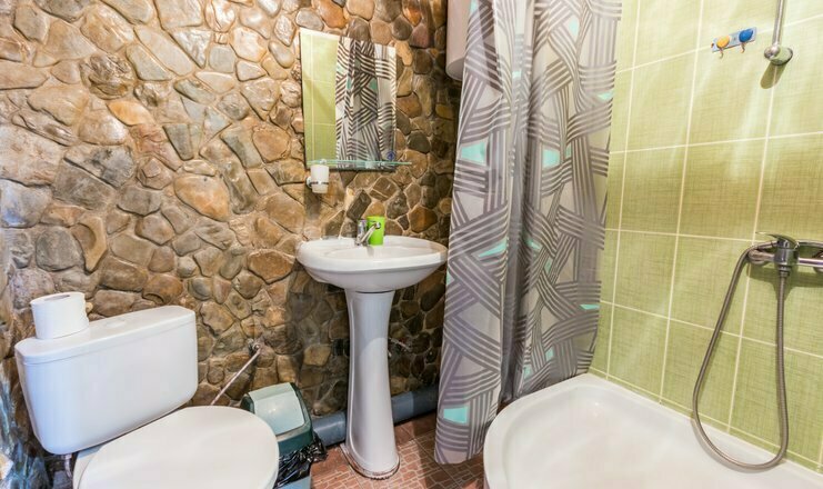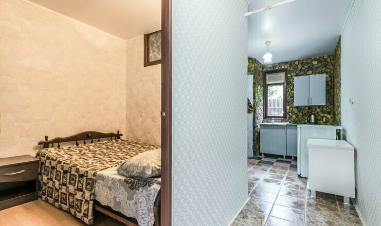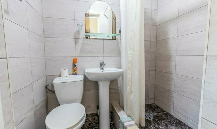 Однокомнатный номер. Двуспальная кровать, односпальный диван, телевизор, кондиционер, душ и туалет общий на 2 номера, холодильник на 3 номера, полотенца кроме пляжных.