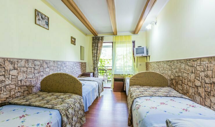 Однокомнатный номер. Двуспальная кровать, два односпальные кровати, кондиционер, телевизор, шкаф-гардероб, душ и туалет в номере, полотенца кроме пляжных. Общий балкон.