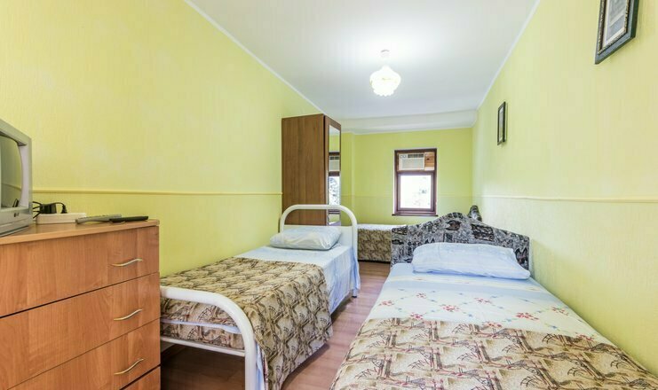 Однокомнатный номер. Двуспальная кровать, односпальная кровать, кондиционер, телевизор, шкаф-гардероб, тумбочка, кушетка, душ и туалет в номере. Холодильник на 3 номера, полотенца кроме пляжных. Общий балкон.