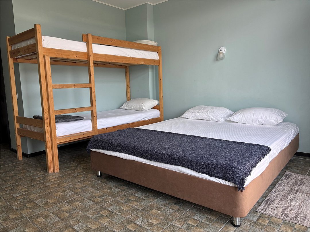 Стандартный четырехместный номер с удобствами, 1 двуспальной кроватью и 1 двухъярусной кроватью, 1 дополнительным раскладным спальным местом. С балконом.Услуги и удобства