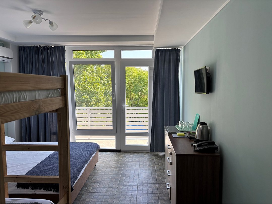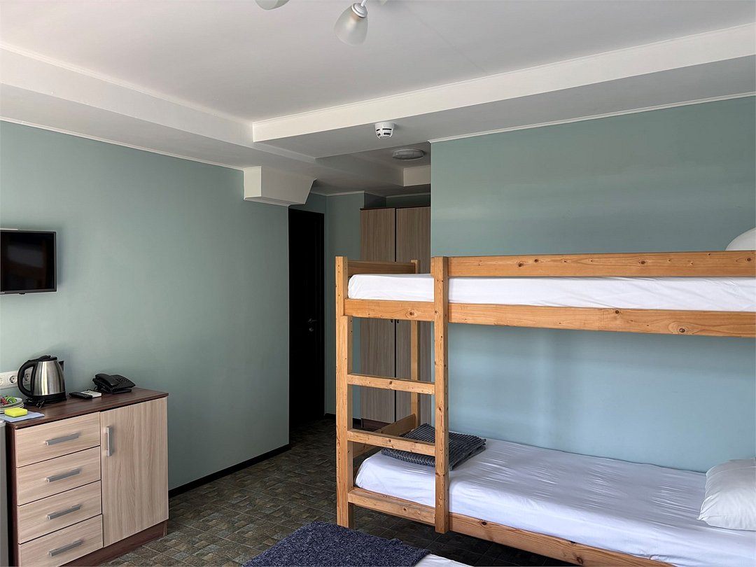 телевизор, Wi-Fi, кондиционер, душевая кабина, банные полотенца, балкон, двуспальная кровать, стулья, шкаф для одежды, комод, набор посуды, сейф, чайник, плиточное покрытие, стаканы, стол, туалет, сушилка для белья, мини-холодильник, номер для некурящих, двухъярусная кровать, вешалки-плечикиВ номере