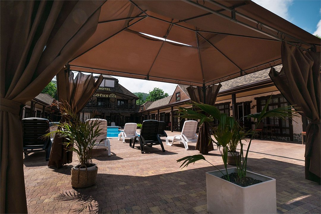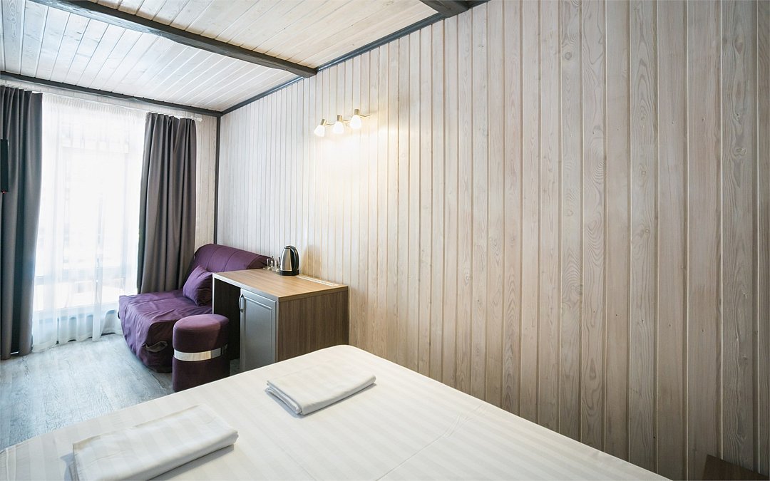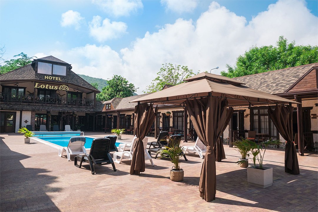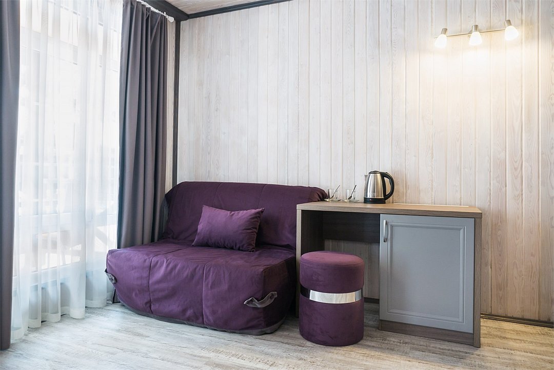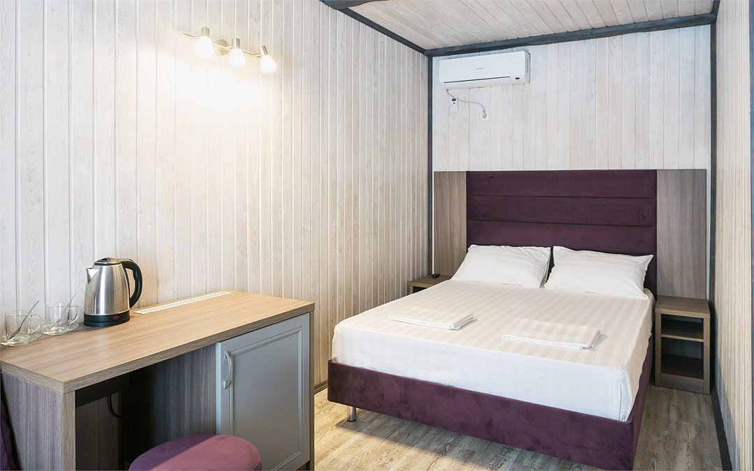 2-местный Стандарт с цельной кроватью и дополнительным местом (диван 1,2 м) Просторный номер с цельной двуспальной кроватью — идеально для пар или семей с детьми. В номере: Полноценная двуспальная кровать Удобный диван шириной 1,2 м — как дополнительное спальное место Комфортное размещение: 2 взрослых + 2 ребёнка или 3 взрослых (ребёнок до 5 лет может спать с родителями) Холодильник, телевизор, сплит-система, чайник Санузел с душем Косметика, полотенца и тапочки Персональная зона отдыха с мебелью — прямо перед входом Почему гости выбирают отель «Лотос»: Закрытая охраняемая территория Подогреваемый бассейн 12×4 м (глубина 1,5 м), открыт с 8:00 до 20:00 Личная зона отдыха перед каждым номером Лежаки для загара Первая береговая линия — до моря 5 минут Всё рядом: магазины, рестораны, аквапарк, дельфинарий, парк, аптека, Сбербанк Отдых у моря начинается здесь. Уют, комфорт, бассейн и 5 минут до пляжа — всё, что нужно для отпуска. Забронируйте свой номер уже сегодняУслуги и удобства