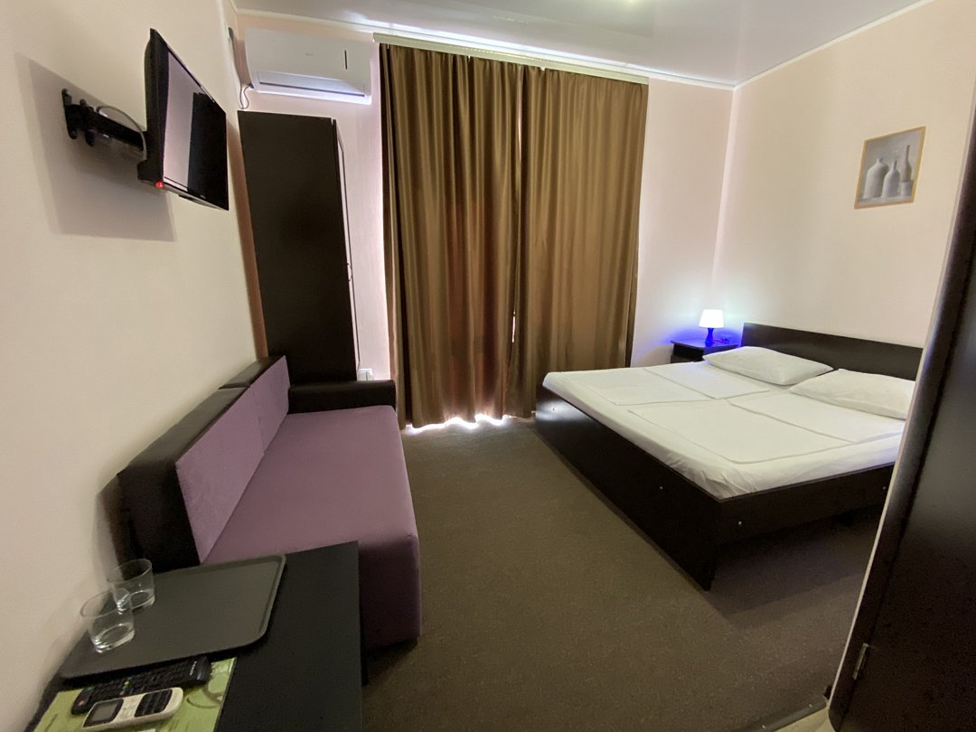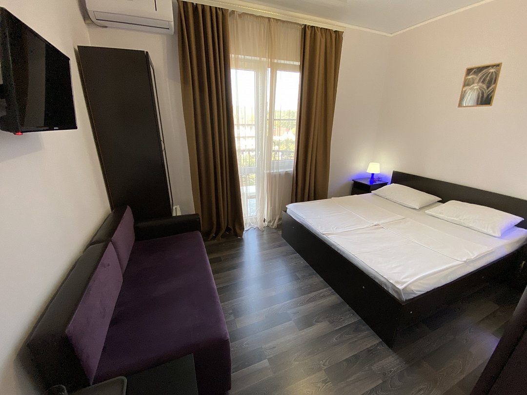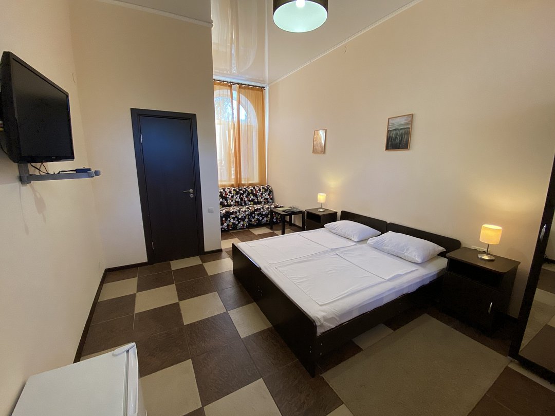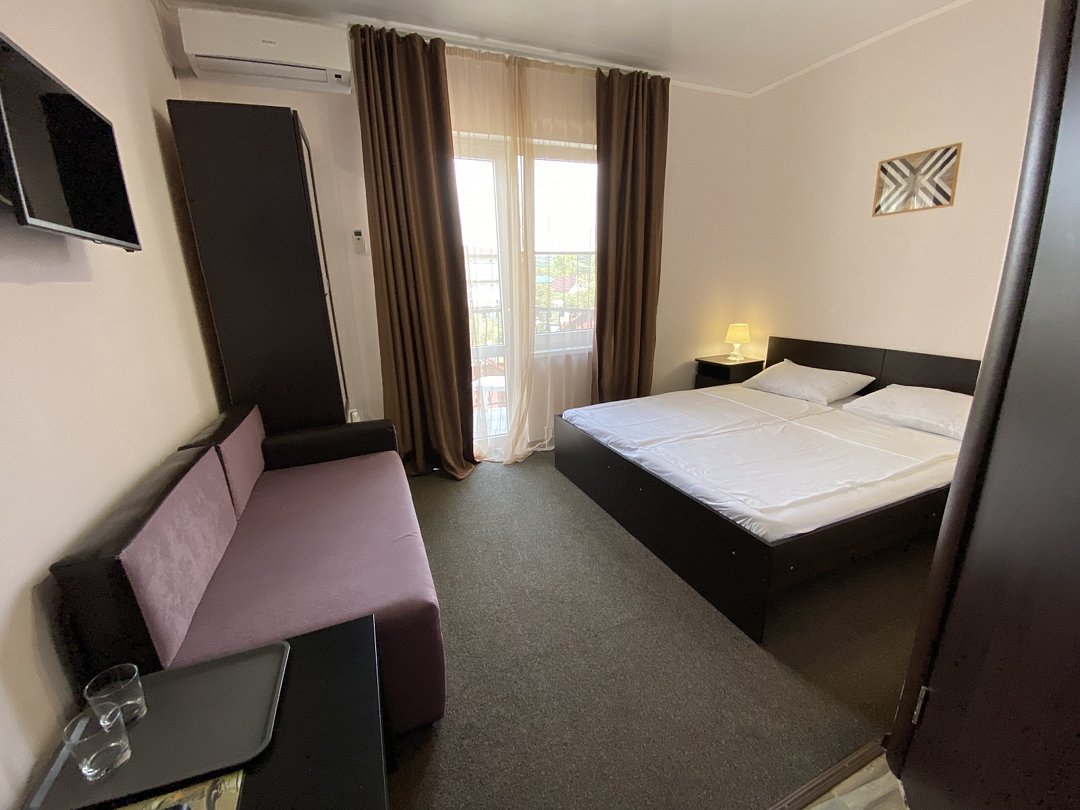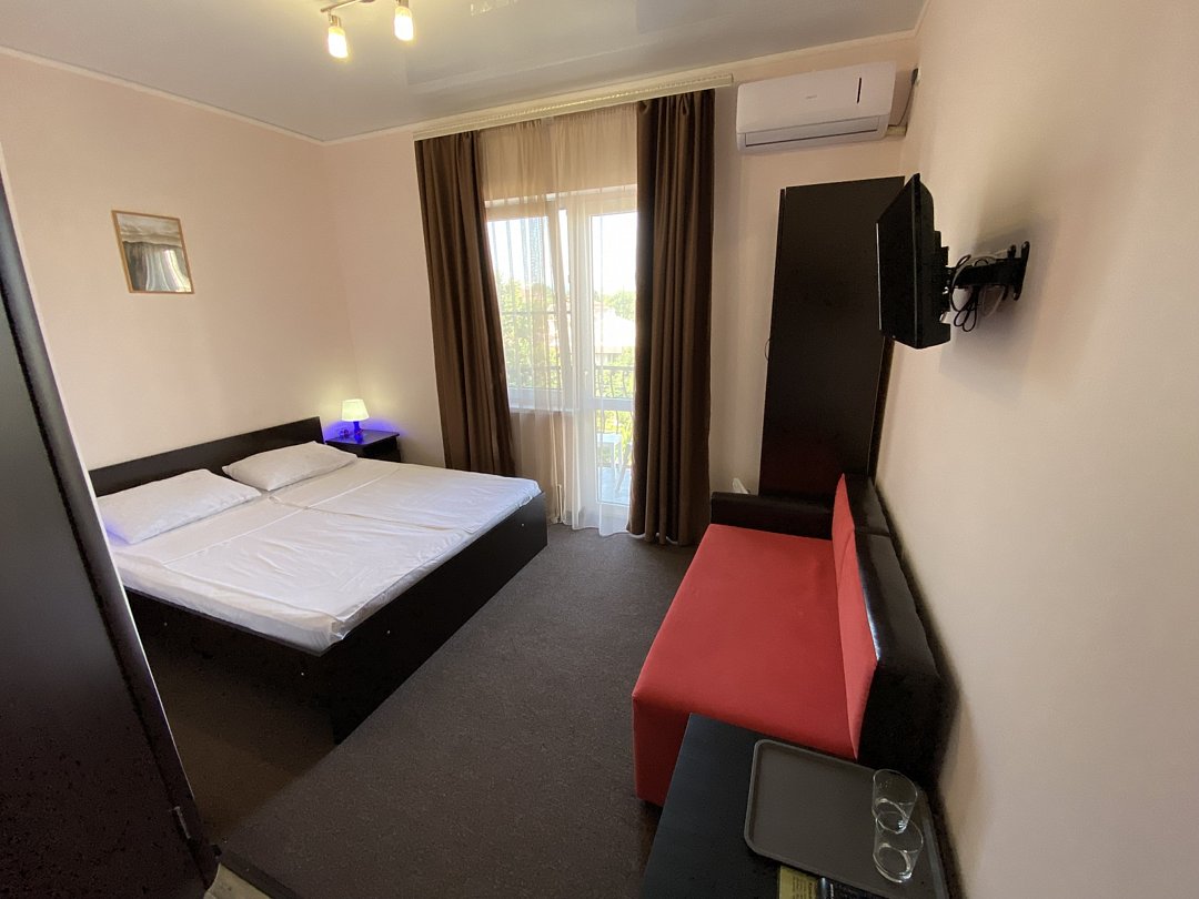 Номера Стандарт расположены на III этаже. Размещение в номере 2-3 человека. Размер номера 16 м2. В номере: двуспальная кровать 180х200 см, раскладной диван 70х190 см, две прикроватные тумбочки, шкафчик для одежды, журнальный столик, сейф. В номере есть: мини-холодильник, сплит, плазменный телевизор. Санузел в номере: душ, туалет, умывальник, фен. Во всех номерах работает бесплатный интернет Wi-Fi. Во все номера предоставляется комплект полотенец и постельного белья. Возможно раздельное расположение кроватей. На окнах москитные сетки и шторы блэкаут. В каждом номере есть балкон для двух человек.В номере