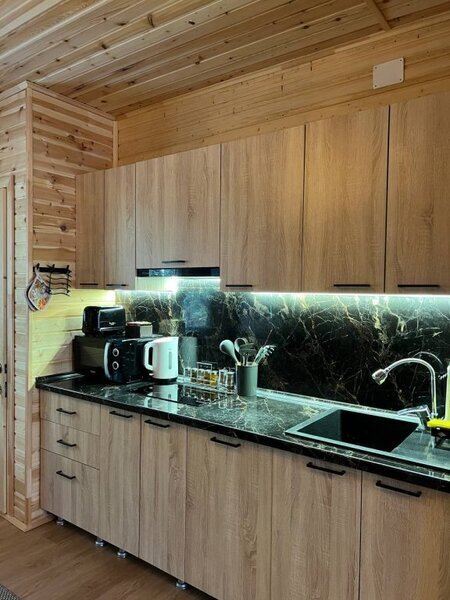 Кухня полностью оснащена современной техникой и необходимой посудой, есть обеденный стол и принадлежности для барбекю.