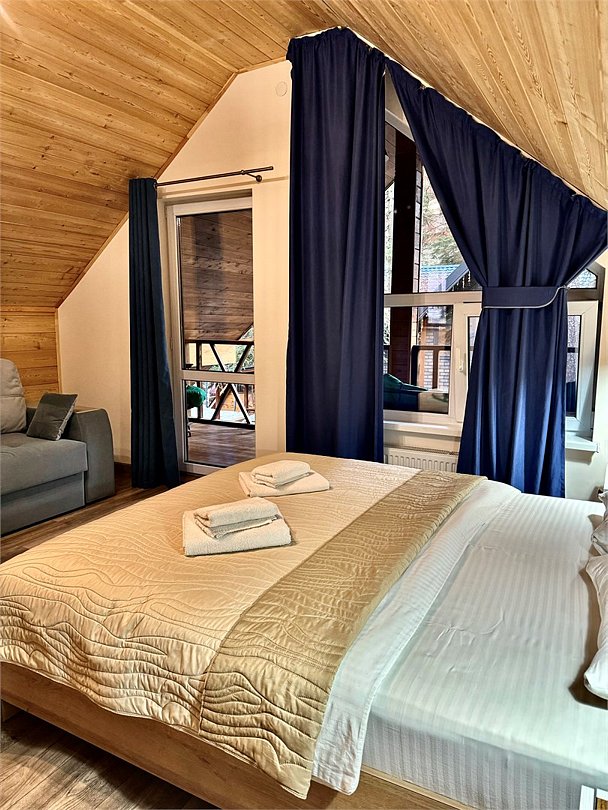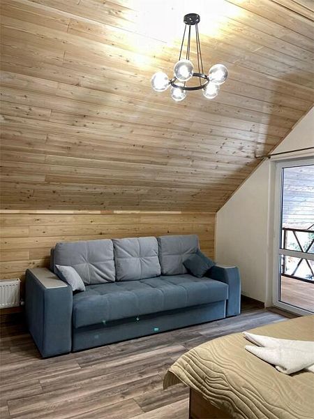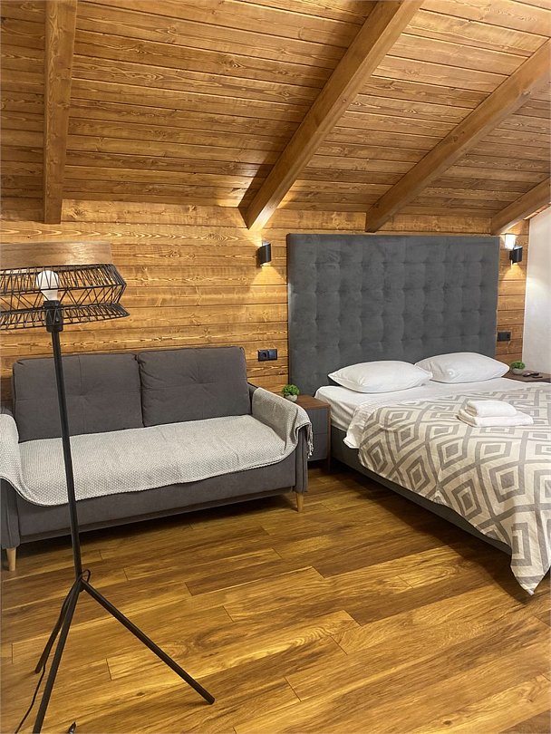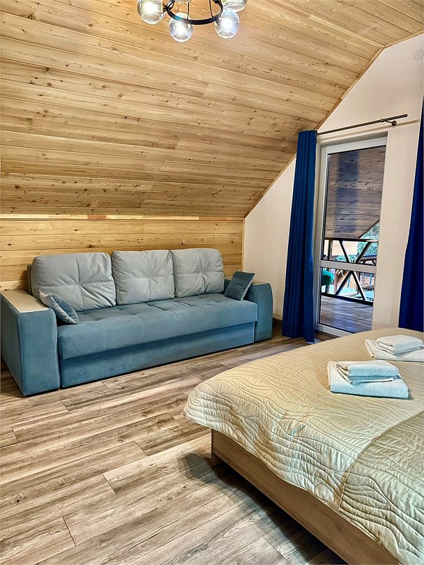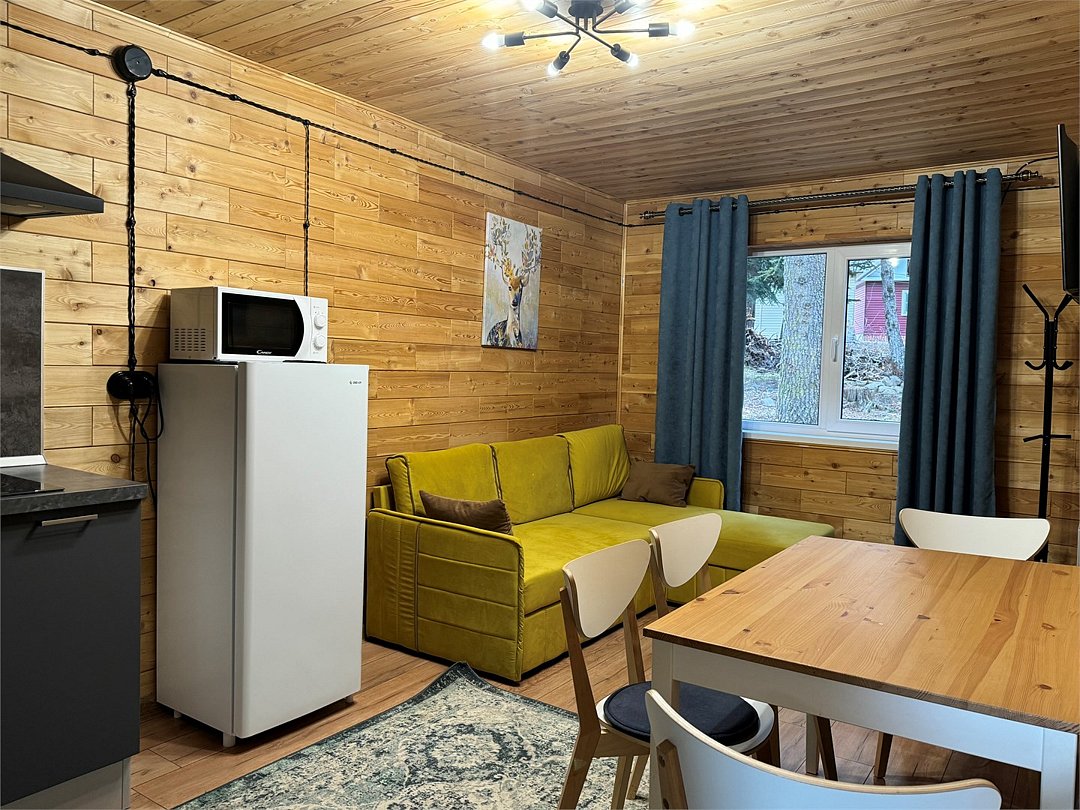 телевизор, Wi-Fi, холодильник, банные полотенца, тапочки, две двуспальные кровати, диван, стулья, чайник, три комнаты, стол, туалетные средства, вид на лес, пуфик, морозильная камера, два дивана-кровати, экологичный подход, мылоВ гостиничном номере