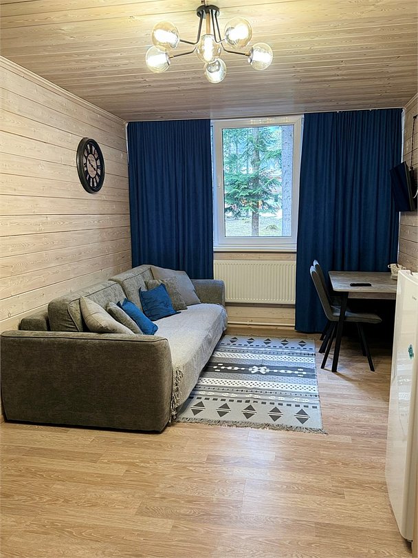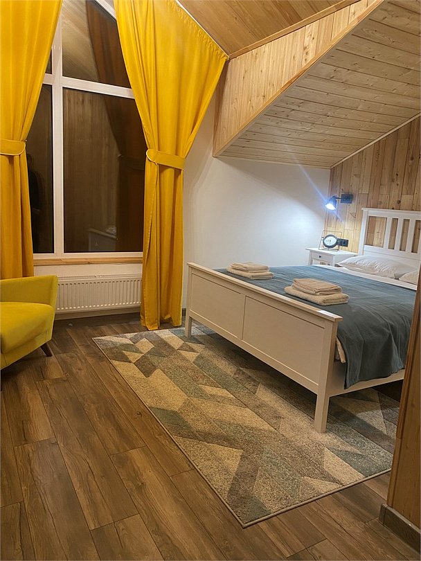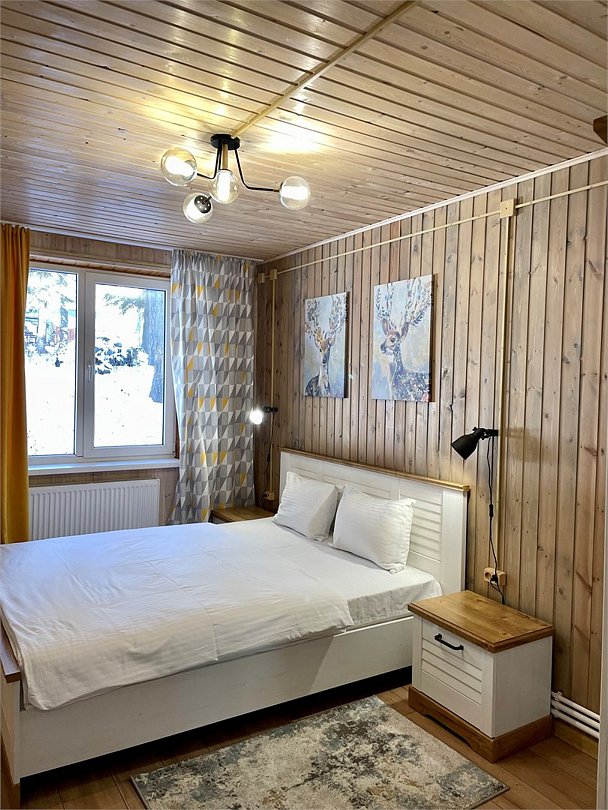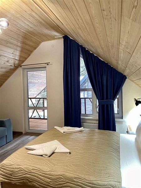 Номер площадью 48 м2 с двумя раздельными спальнями. спальни объединяет просторная гостиная где имеется стол и стулья для совместных посиделок. Вид из окон номера на лес.Услуги и удобства