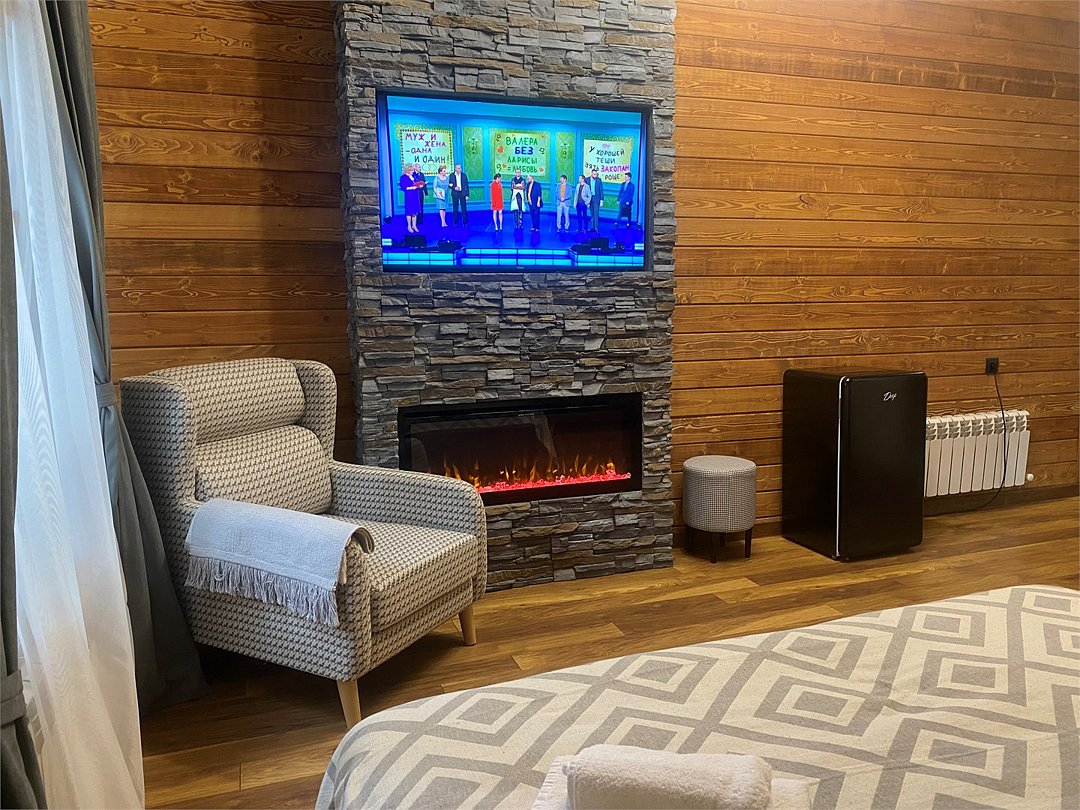 Невероятно уютный номер с электрокамином среди леса никого не оставит равнодушным. Вмещает номер от 1-го до 4-х человек.Услуги и удобства