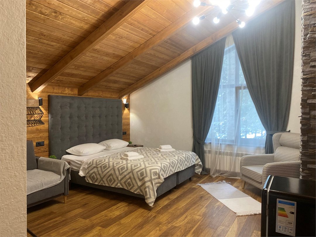 Wi-Fi, светильник, фен, санузел, водонагреватель, банные полотенца, тапочки, двуспальная кровать, шкаф для одежды, камин, чайник, кресло, вид во двор, высокие потолки, туалетные средства, диван-кровать, телевизор с плоским экраном, мини-холодильник, вид на лес, мылоВ гостиничном номере