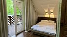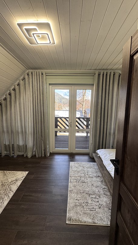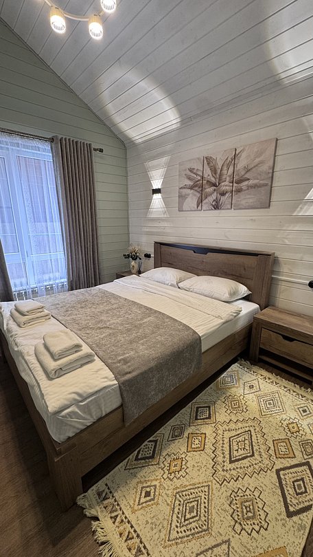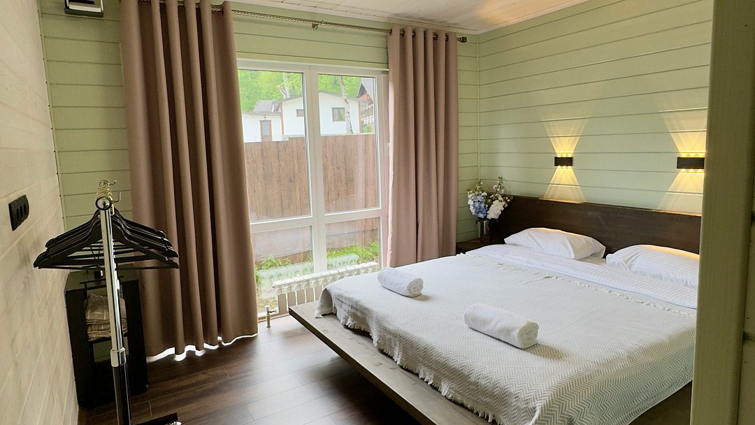 2 этаж: двуспальная кровать с видом на горы и лес.