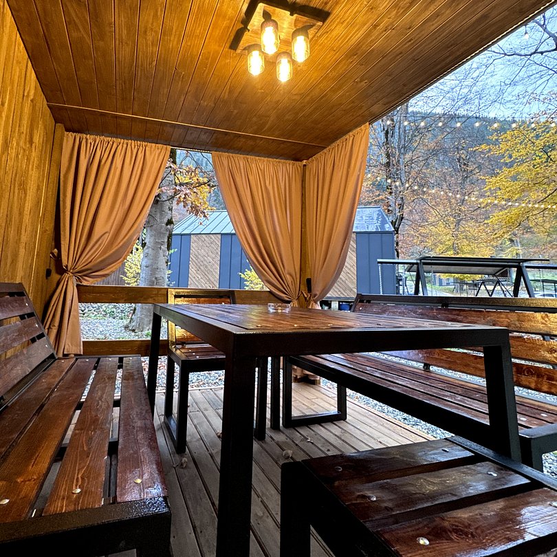 На территории: мангальные зоны, очаговая зона, детская площадка, беседка, качели, батут, горный ручей.