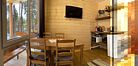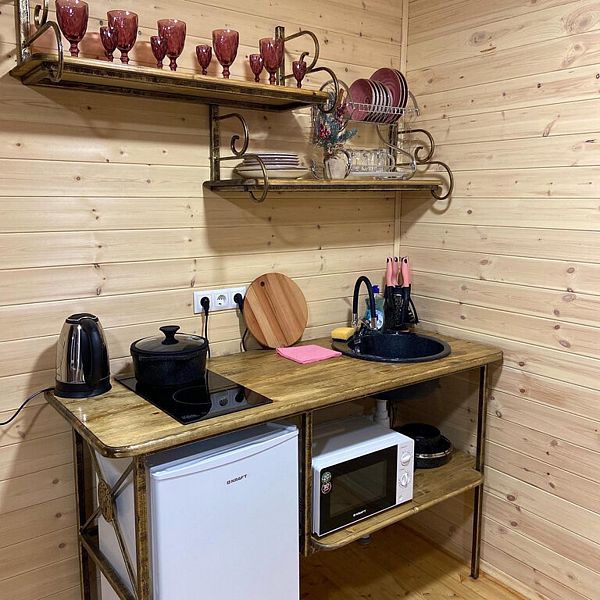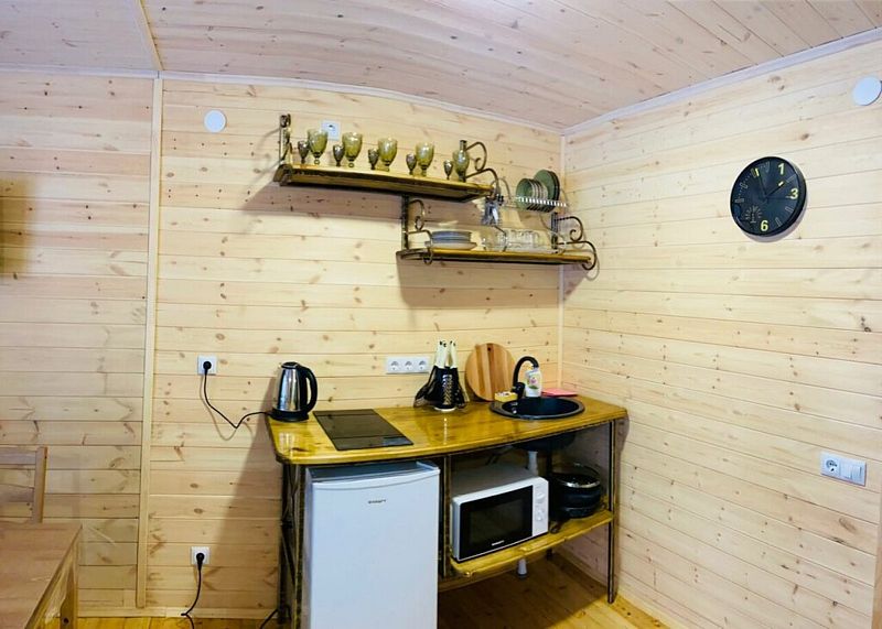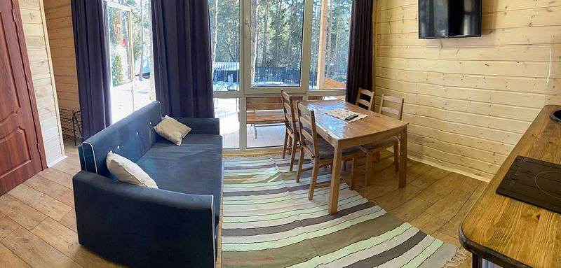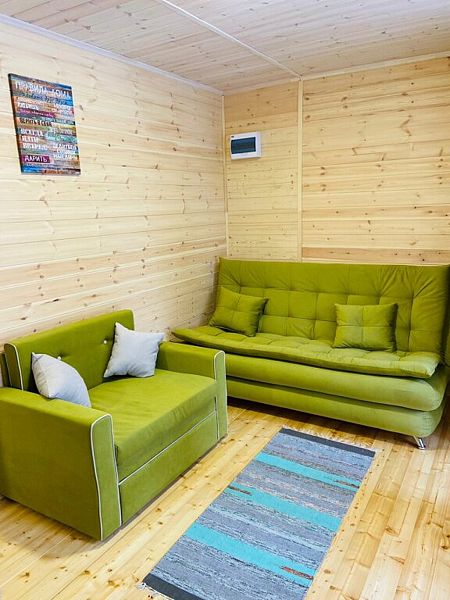 В доме одна изолированная спальня, гостевая кухня, душевая комната. Релакс диван на двух человек, кресло кровать на 1 человека, в спальне — двуспальная кровать ручной работы с ортопедическим матрасом.