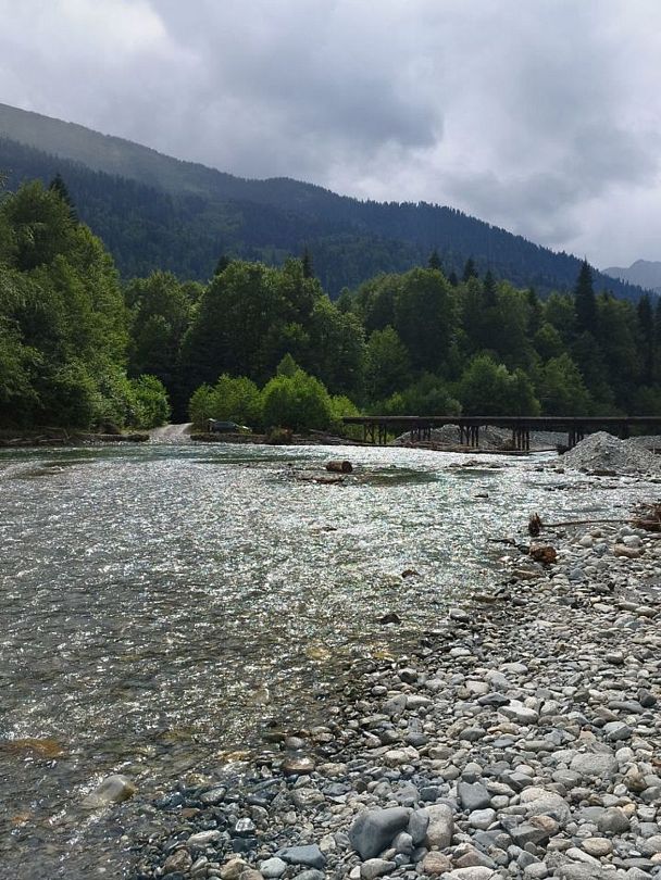 Далее по основной дороге 1.5 км до Софийской поляны. Ориентир-рынок квадроциклы и мечеть. Переезжаете мост через реку Псыш и двигаетесь по основной дороге 1.5 км до моста через реку София.