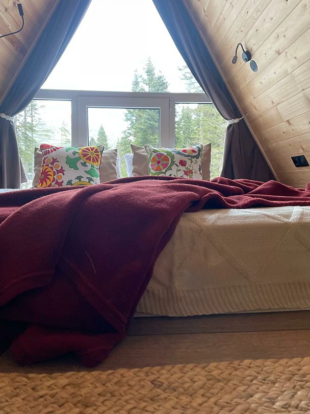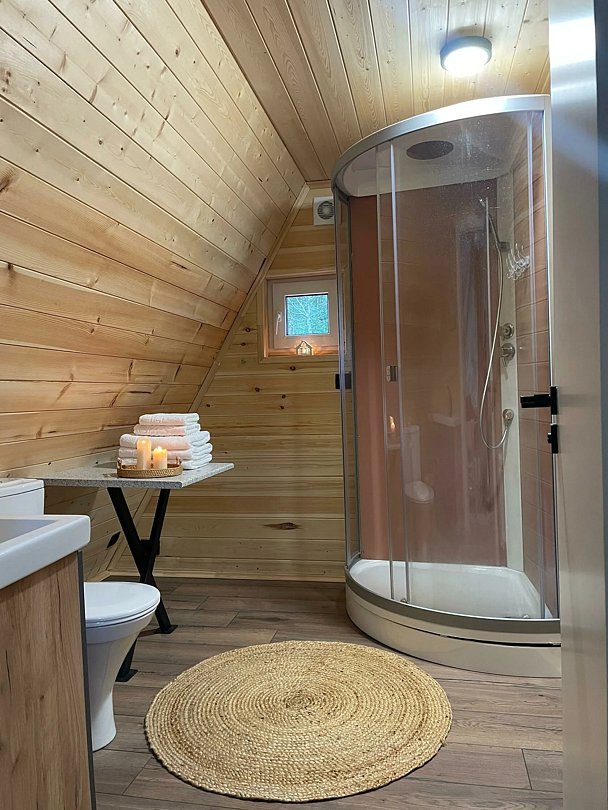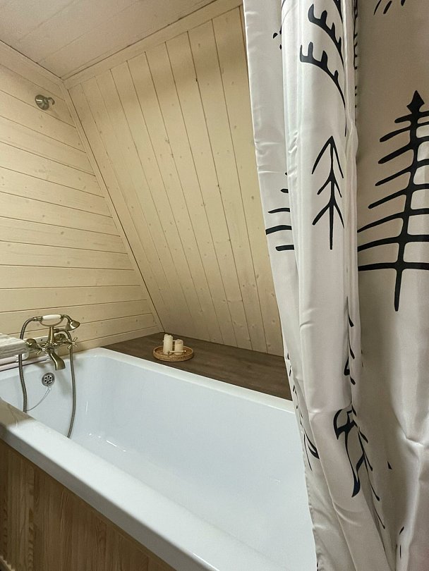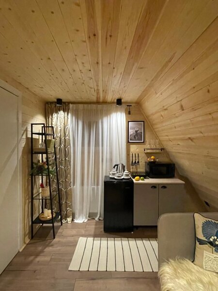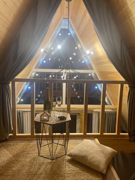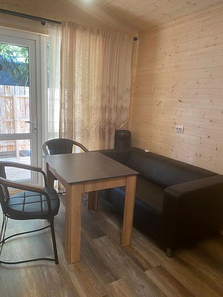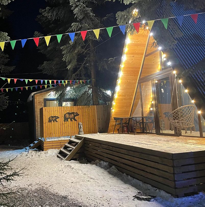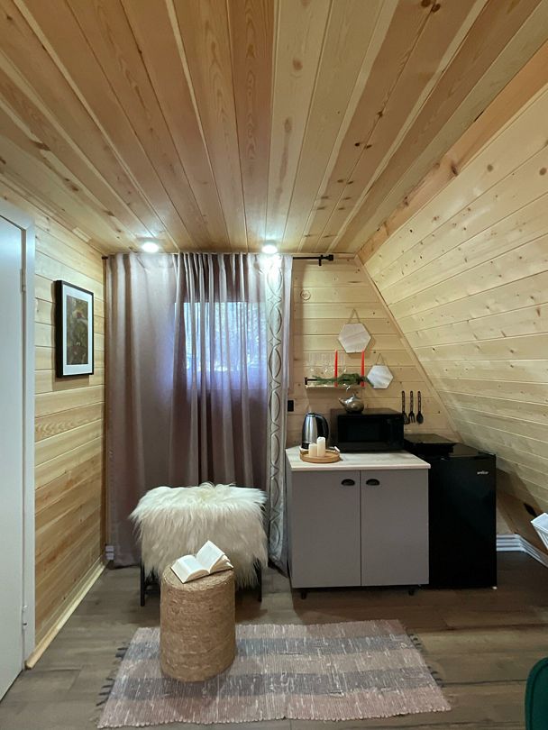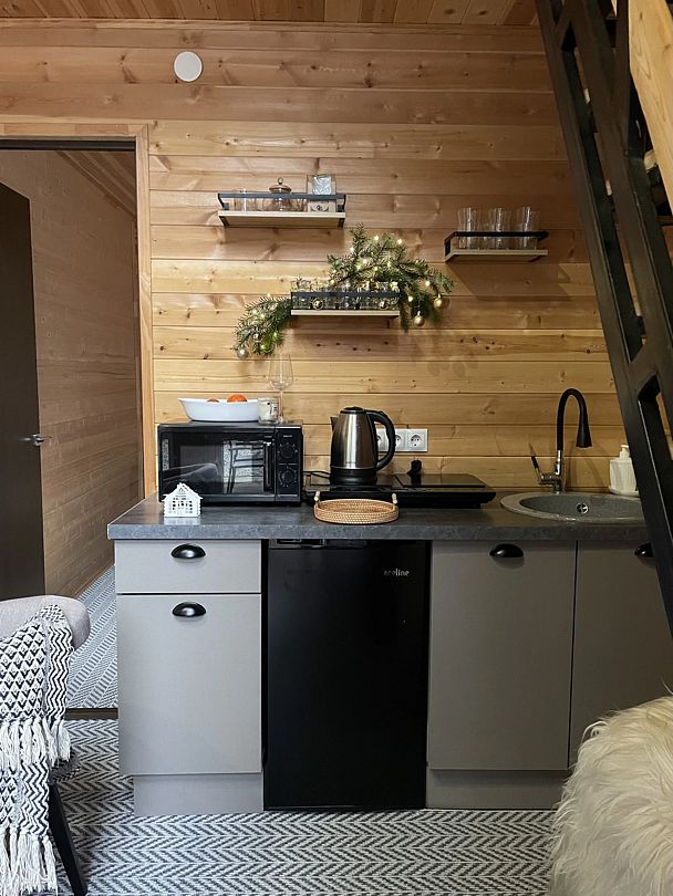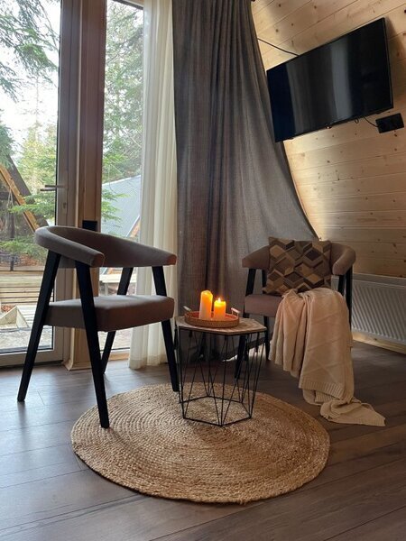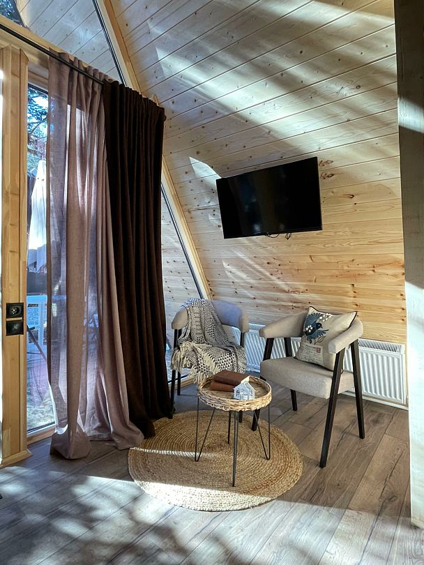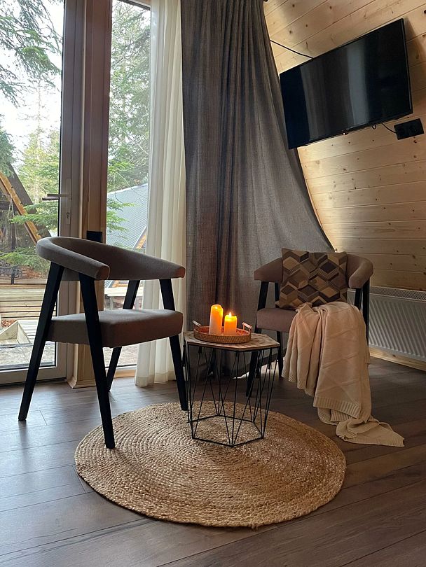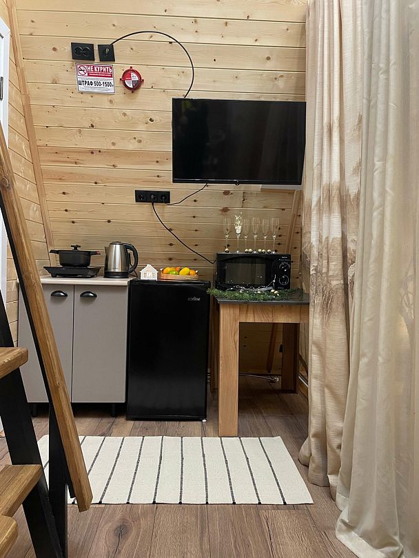 Комфортабельные домики оснащены всем необходимым для вашего беззаботного отдыха: телевизор, холодильник, микроволновка, индукционная плита, чайник, посуда и фен.