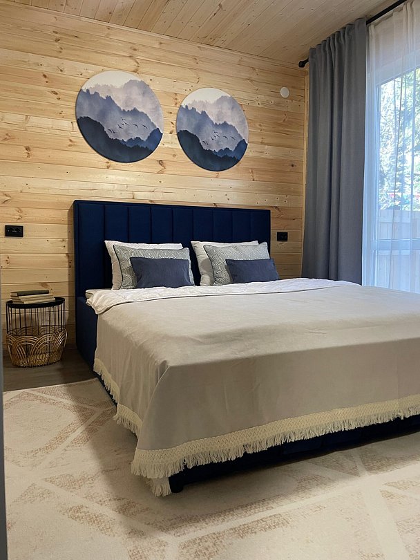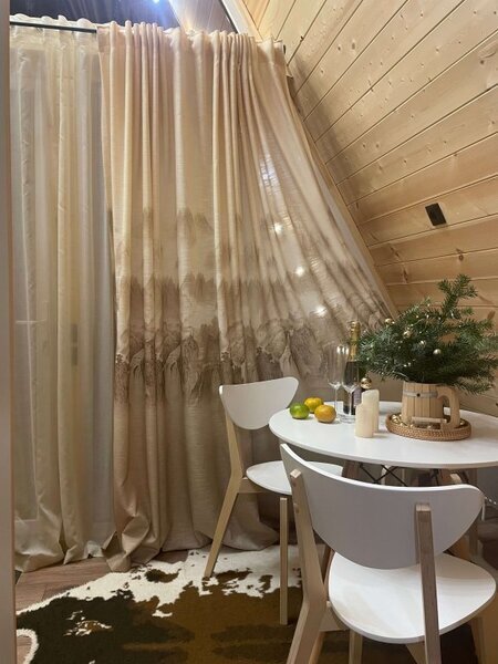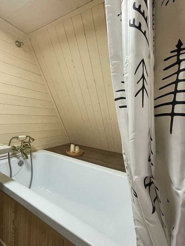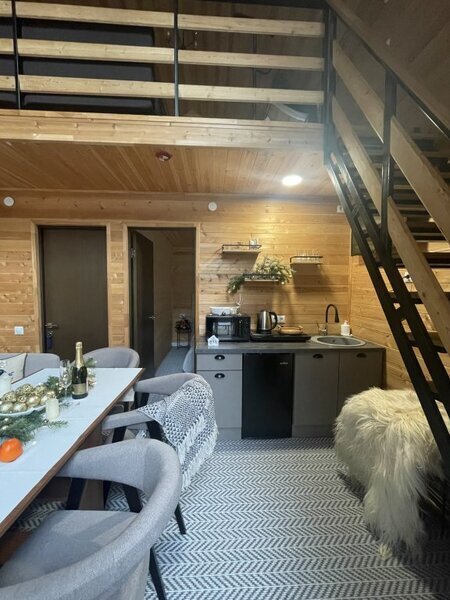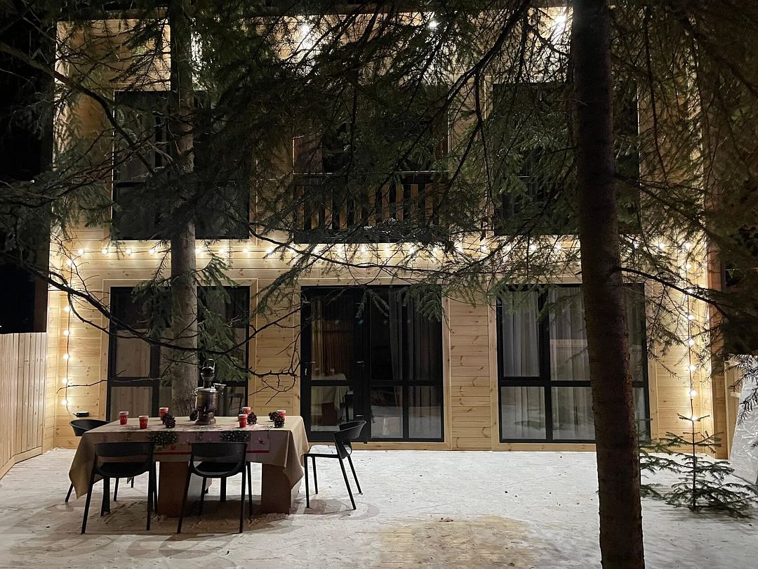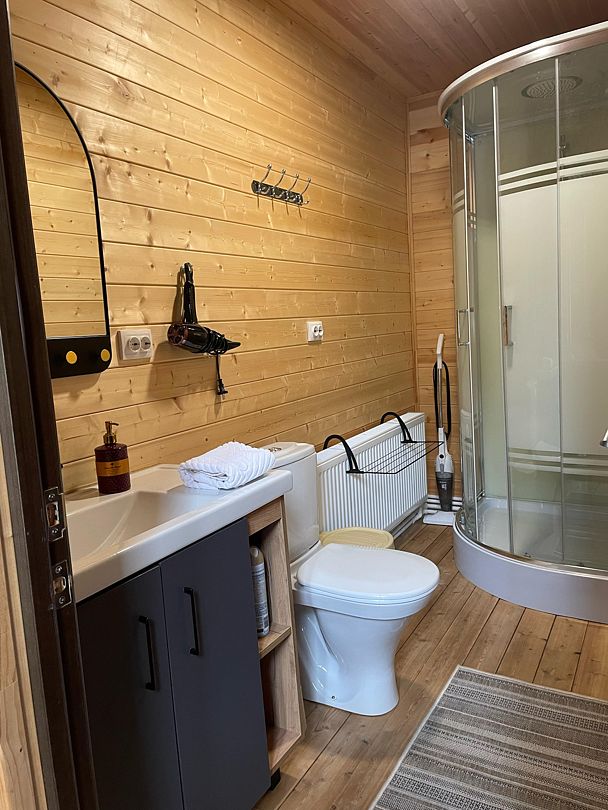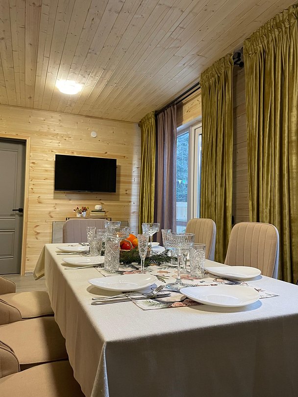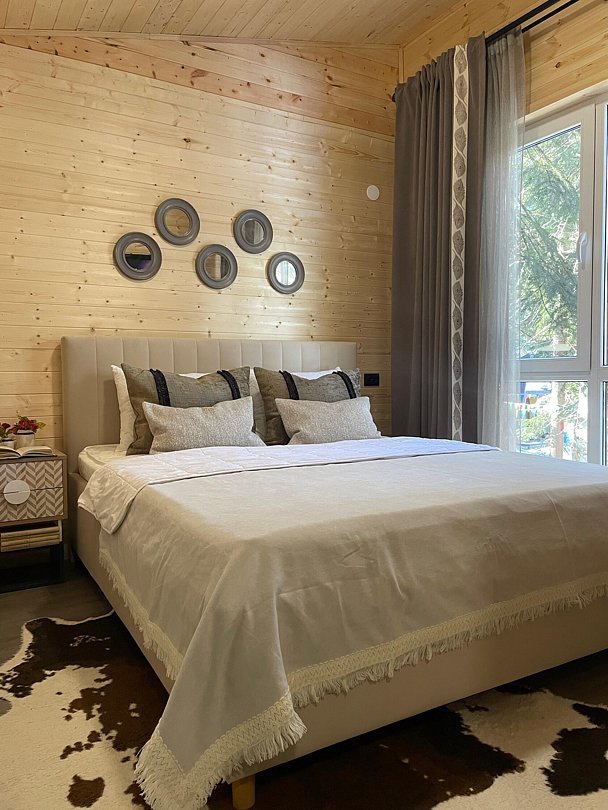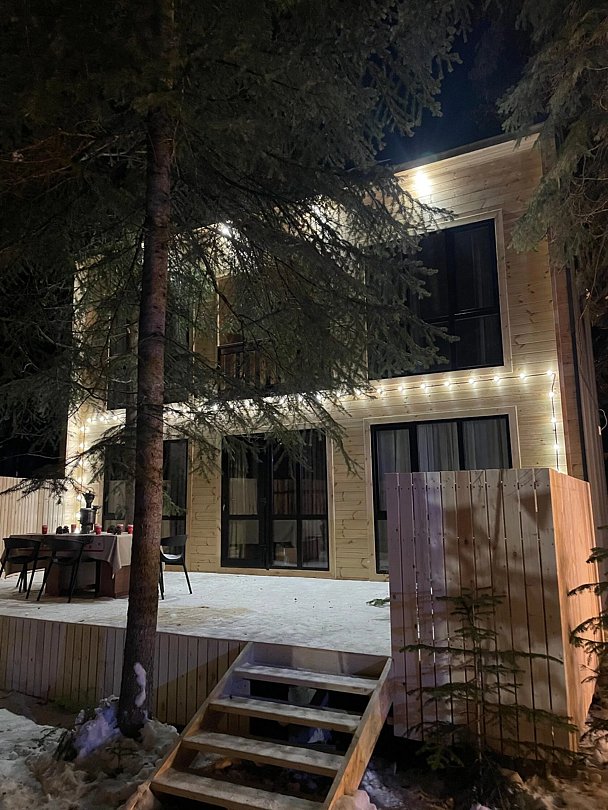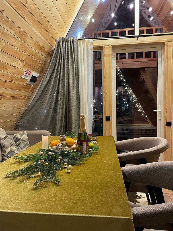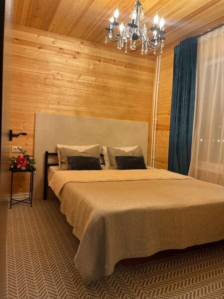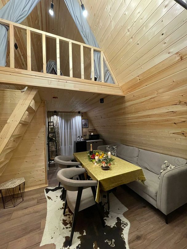 Двухэтажный коттедж с панорамными окнами и большой террасой. Персональная мангальная зона. 3 спальни с двуспальными кроватями. Все комнаты с телевизорами с функцией smart tv. Гостиная совмещена с кухней, есть вся необходимая бытовая техника и посуда (холодильник, микроволновка, электроплита, чайник). В гостиной раскладной двуспальный диван. Два санузла с душевыми кабинами. На втором этаже французский балкончик для романтического отдыха.