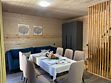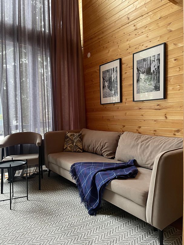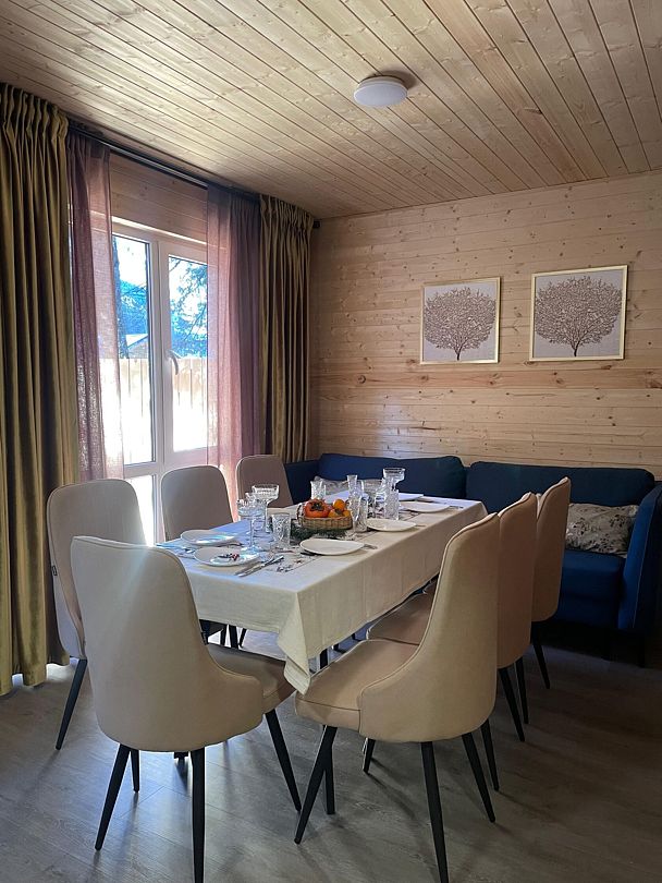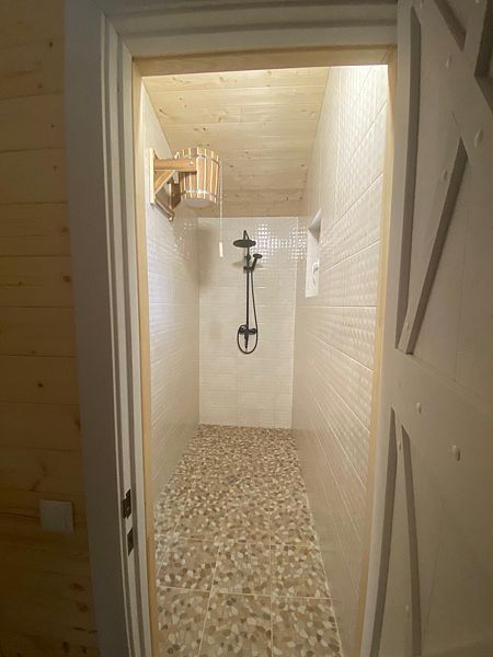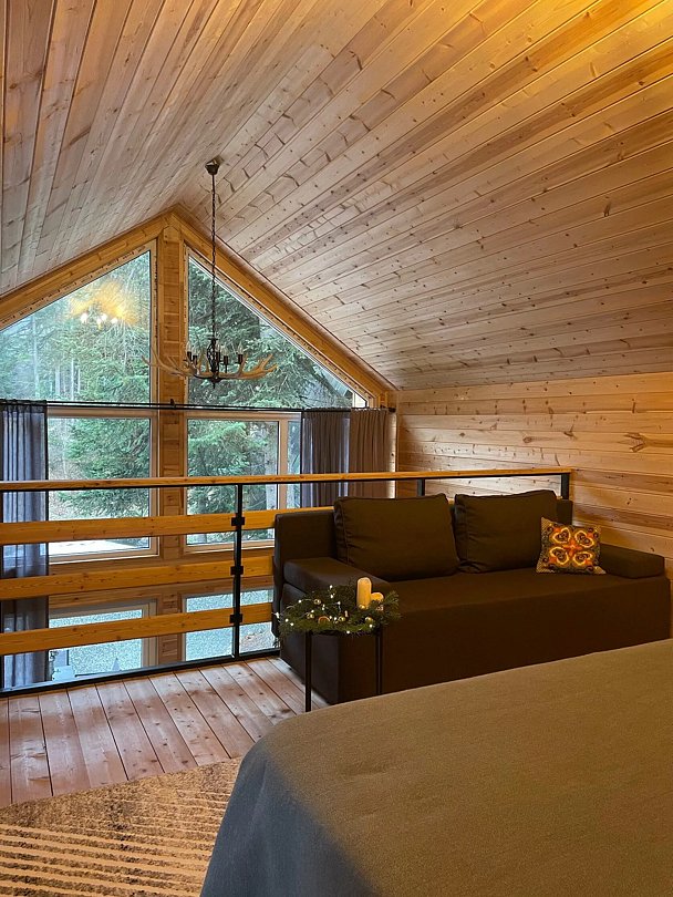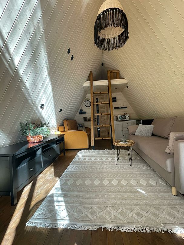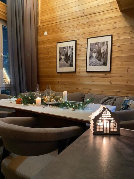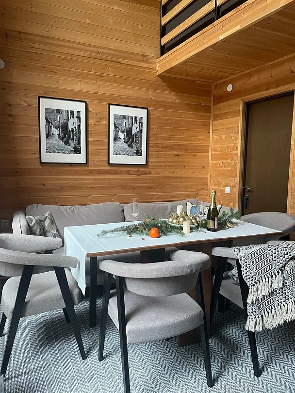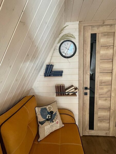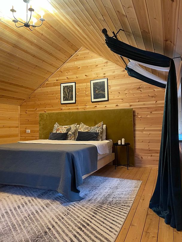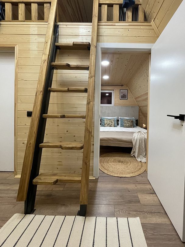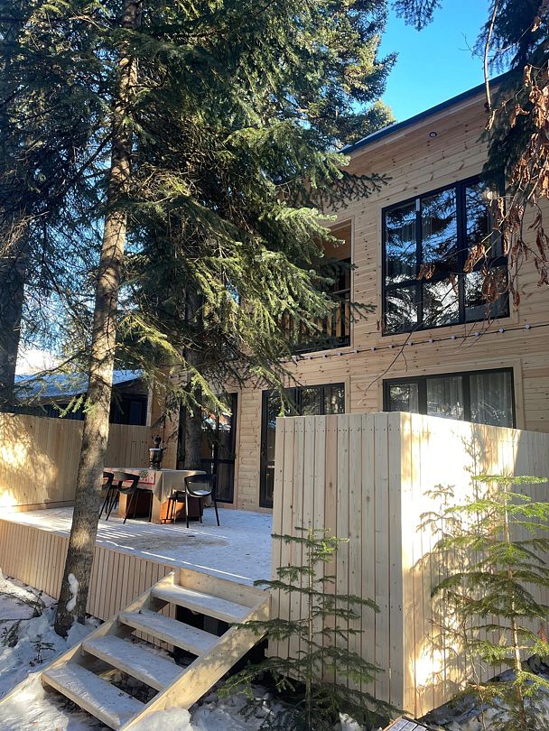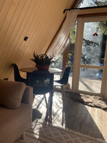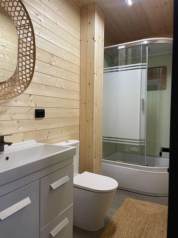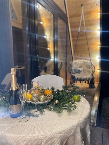 Двухэтажный коттедж с панорамными окнами и большой террасой. Персональная мангальная зона. 3 спальни с двуспальными кроватями. Все комнаты с телевизорами с функцией smart tv. Гостиная совмещена с кухней, есть вся необходимая бытовая техника и посуда (холодильник, микроволновка, электроплита, чайник). В гостиной раскладной двуспальный диван. Два санузла с душевыми кабинами. На втором этаже французский балкончик для романтического отдыха.