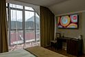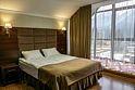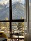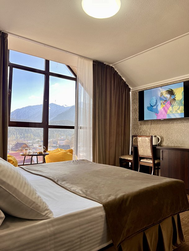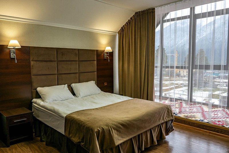 Комфортабельный номер в коричнево-бежевых тонах с незабываемыми горными пейзажами в панорамных окнах.
