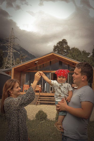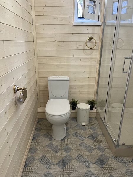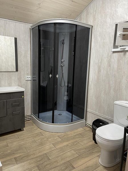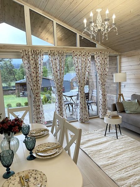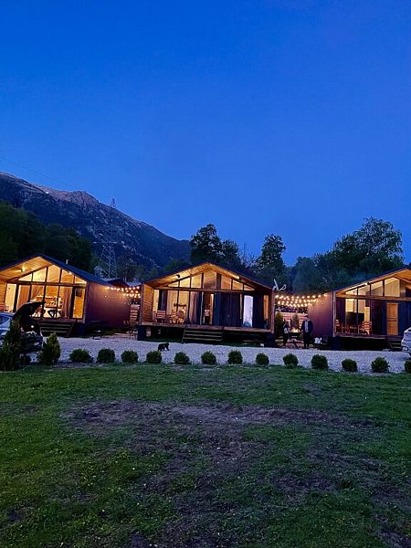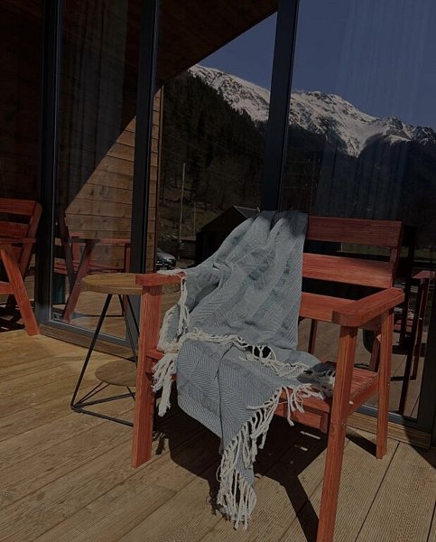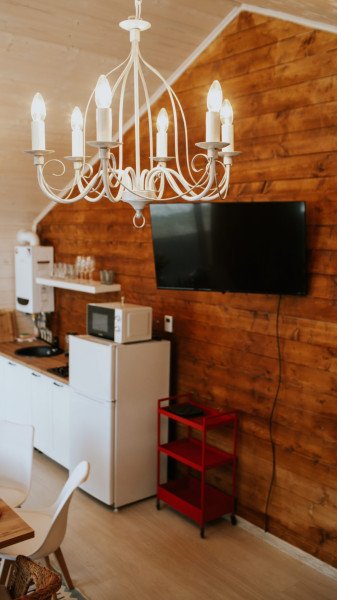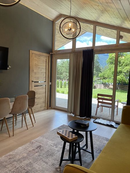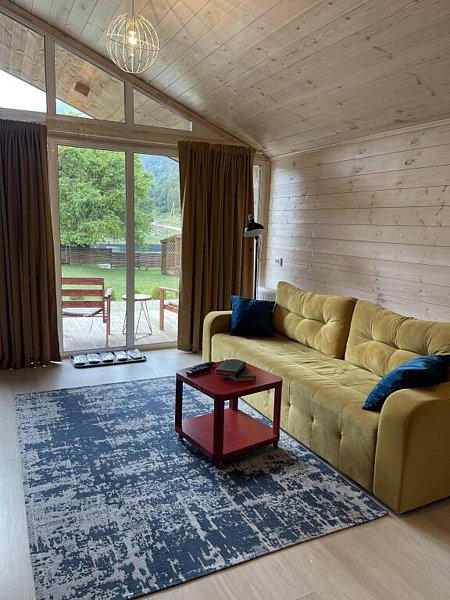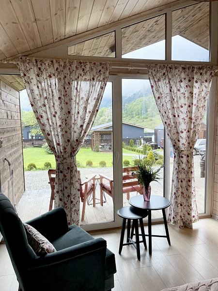 Шале Comfort №1 состоит из спальни, кухни-гостиной, просторной ванной комнаты а также террасы с видом на горы. В спальне удобная кровать с ортопедическим матрасом, в каждой комнате авторские интерьеры и продуманное освещение, из такого домика не хочется возвращаться домой, настолько в нем комфортно. Проектировка дома рассчитана так, чтобы отовсюду были видны красивые пейзажи. Несмотря на большие панорамные окна в доме очень тепло и уютно. В кухонной зоне есть вся необходимая техника и посуда для приготовление пищи.