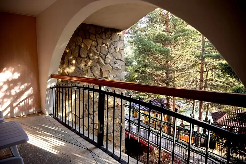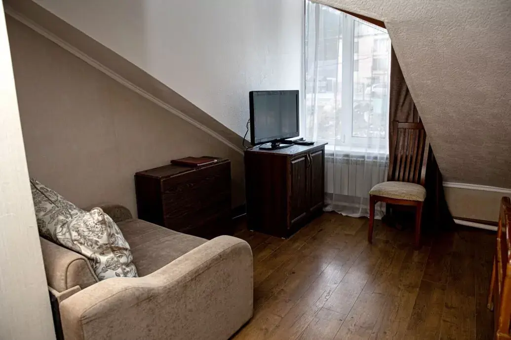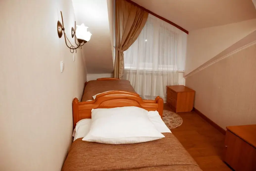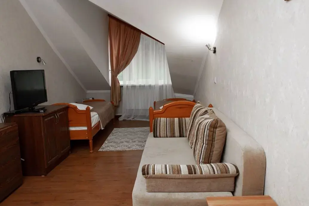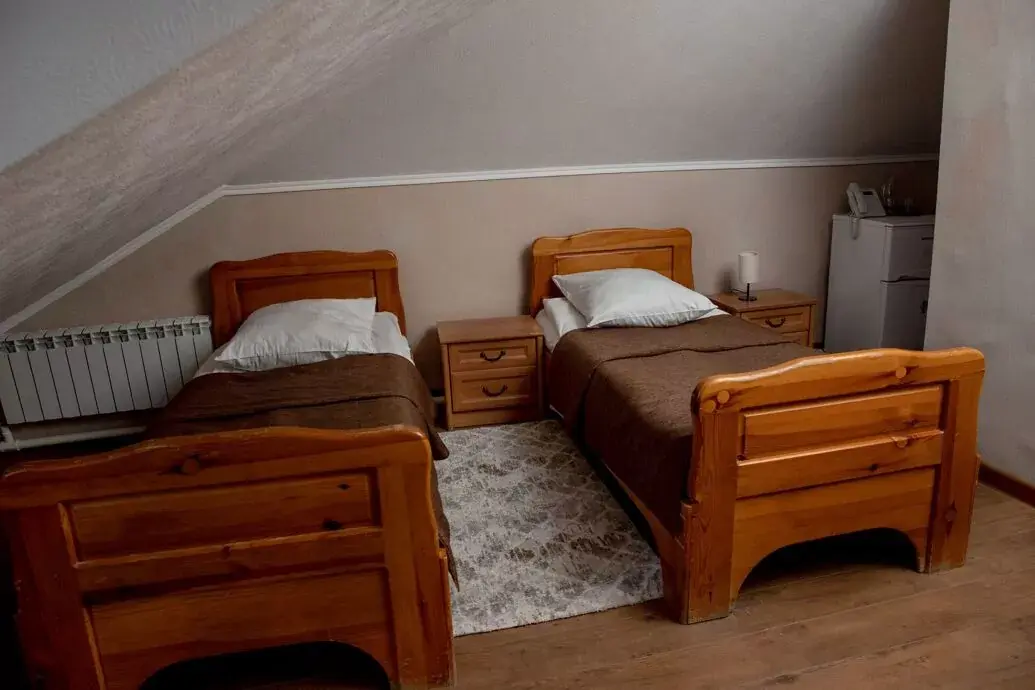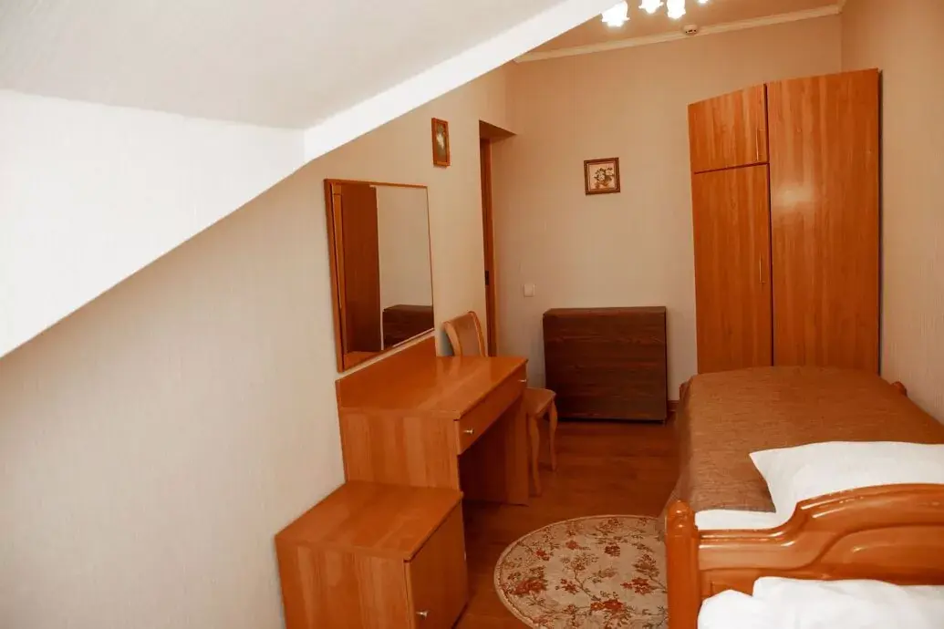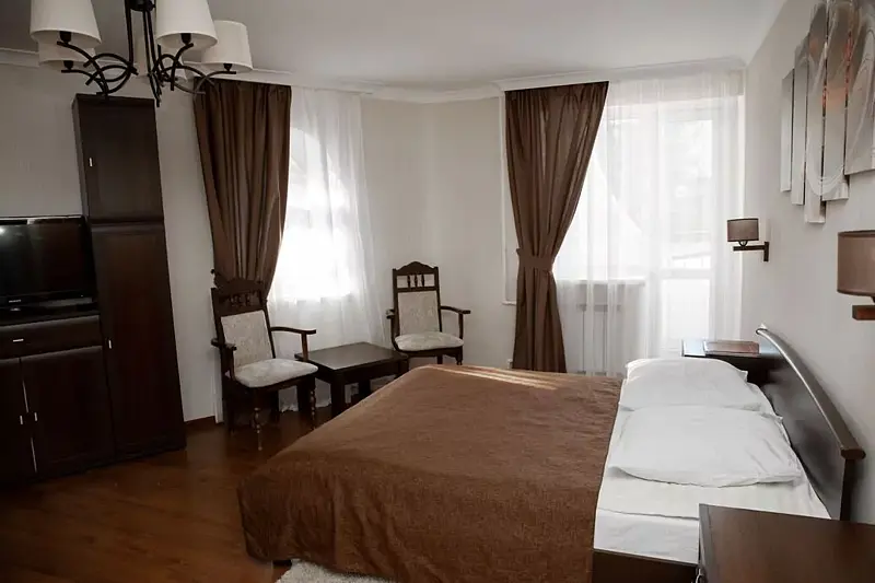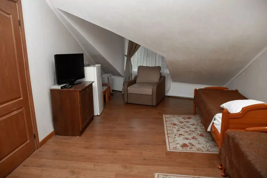 Трехэтажное здание пансионата построено в альпийском стиле по индивидуальному проекту и может разместить до 65 человек. В распоряжении гостей номера различных категорий: эконом, стандарт, стандарт плюс, полулюкс и люкс, каждый из которых оснащён всеми необходимыми удобствами.
