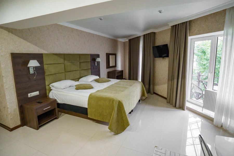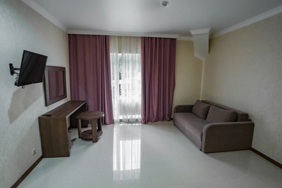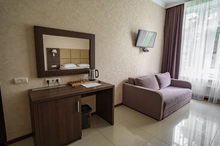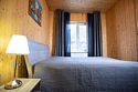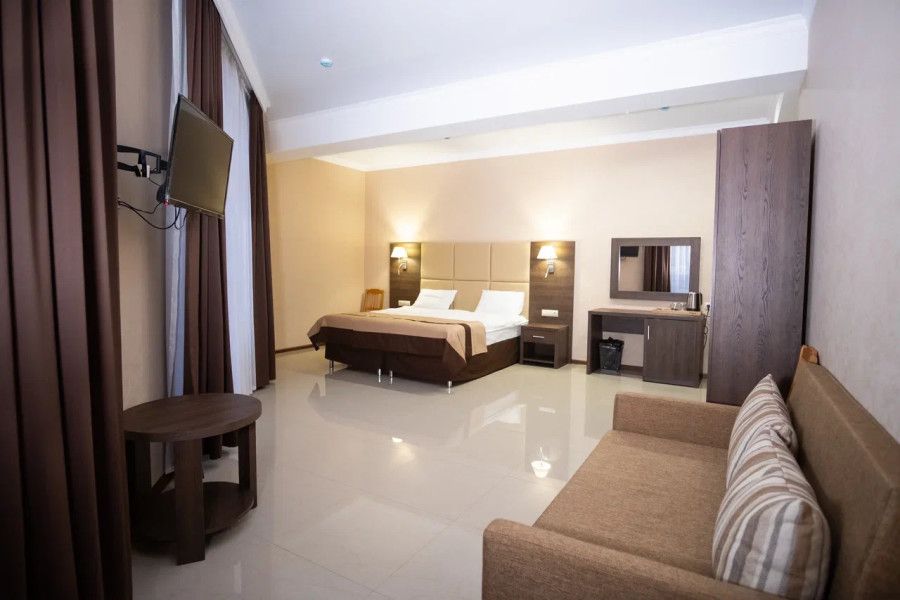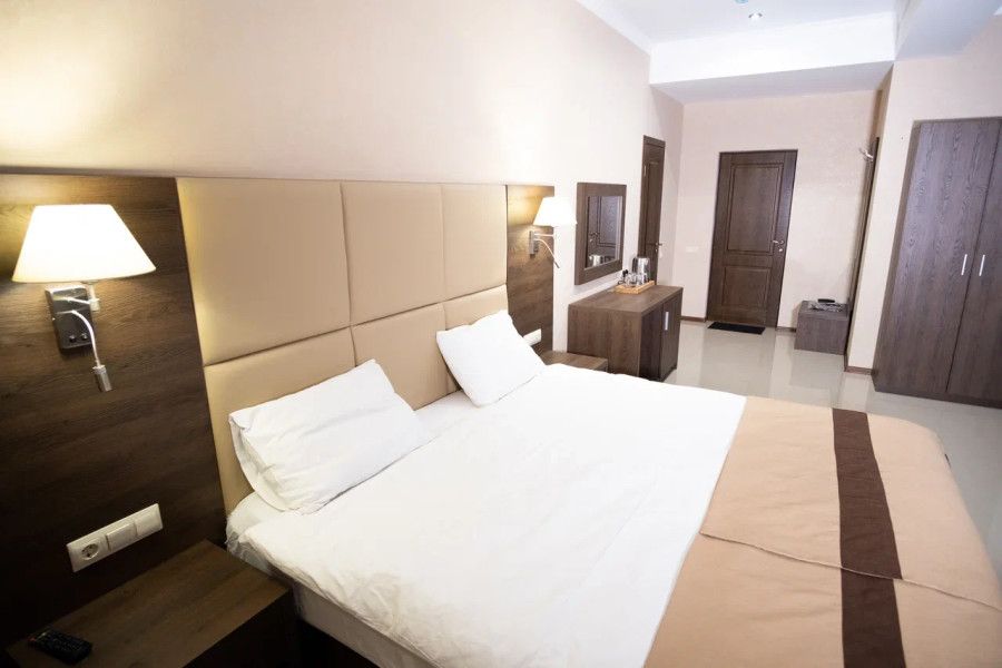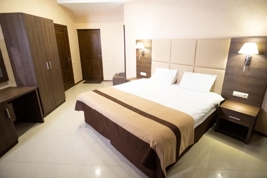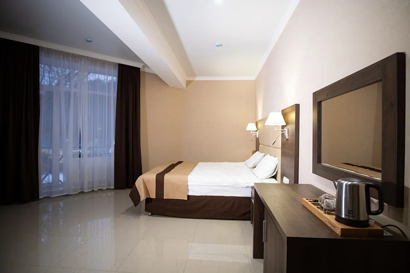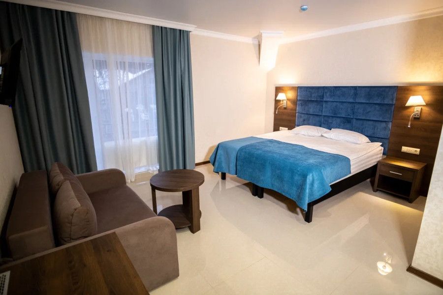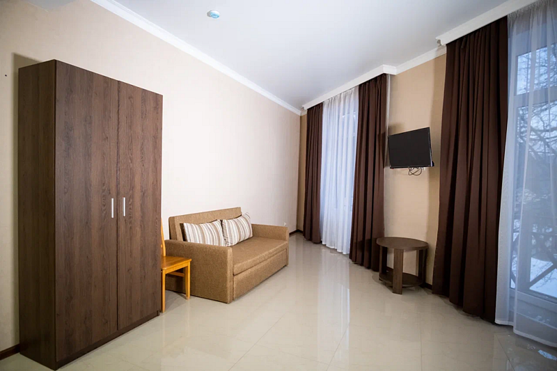 В данном номере вы найдете: двуспальную кровать на 2 человека с возможностью разъединения и кресло-кровать на 1-2 человека, так же шкаф для верхней одежды, две тумбочки, светильники над кроватью для ночного чтения, кухонную зону с обеденным столом, телевизор, холодильник, микроволновку и всю необходимую посуду.