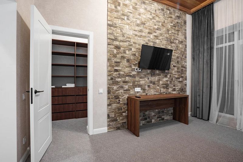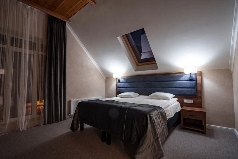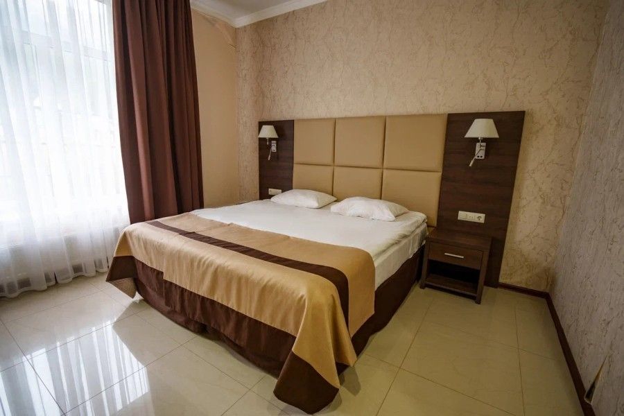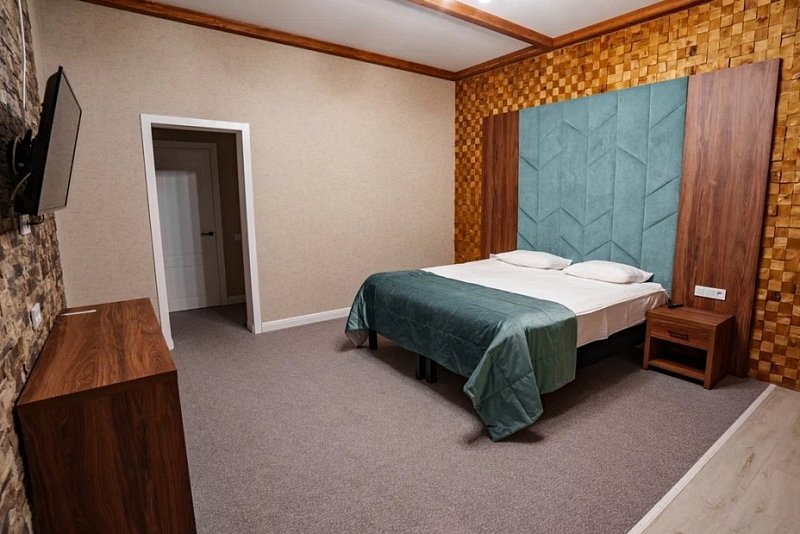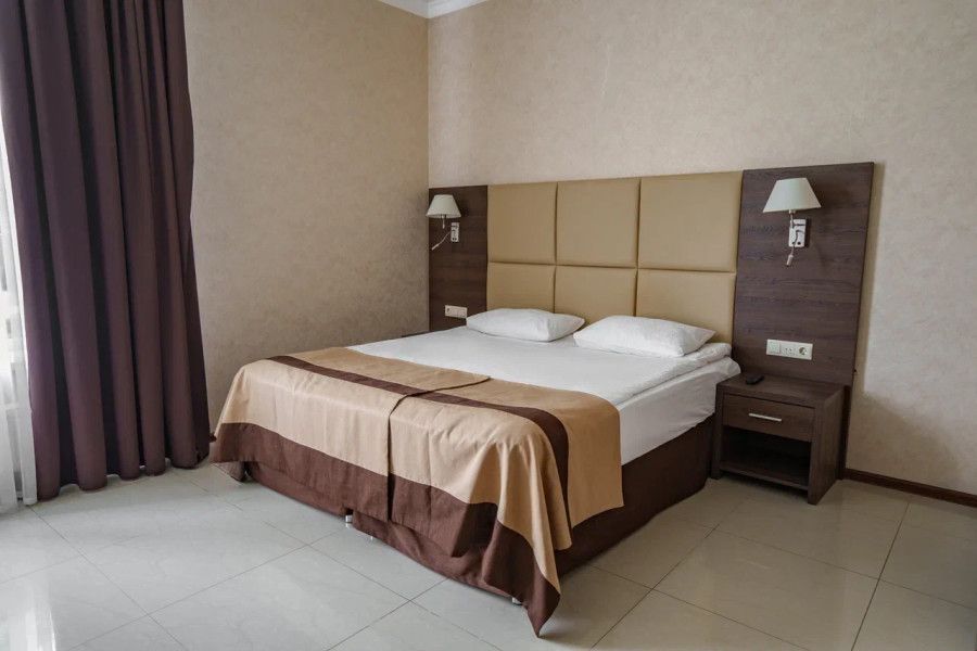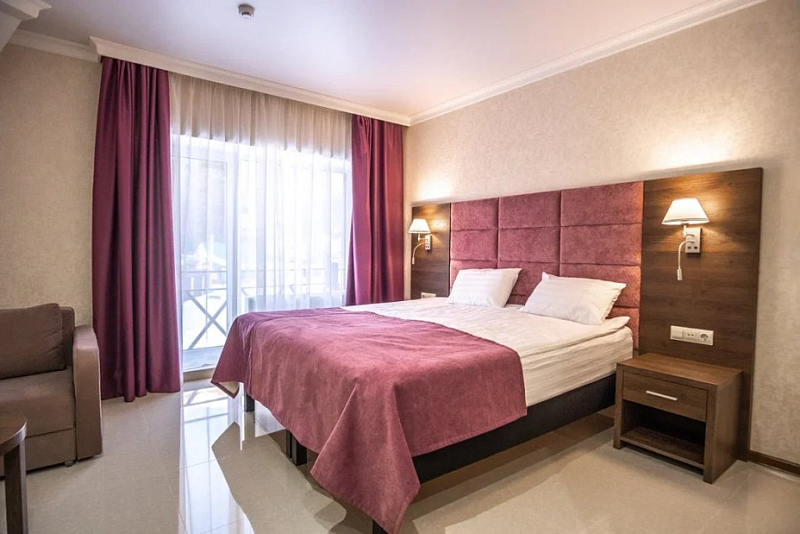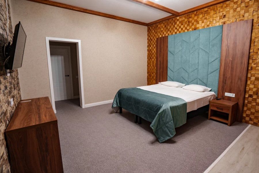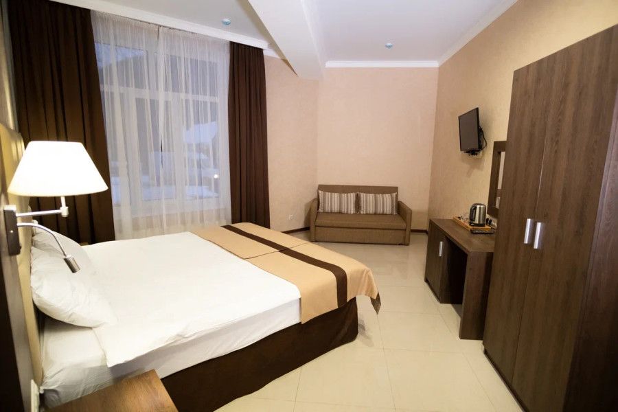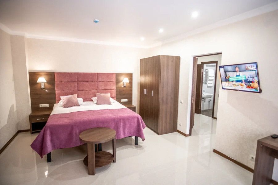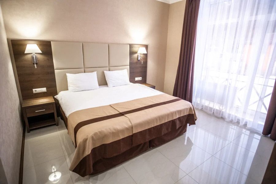 В данном номере вы найдете: двуспальную кровать на 2 человека с возможностью разъединения и кресло-кровать на 1-2 человека, так же шкаф для верхней одежды, две тумбочки, светильники над кроватью для ночного чтения, кухонную зону с обеденным столом, телевизор, холодильник, микроволновку и всю необходимую посуду.