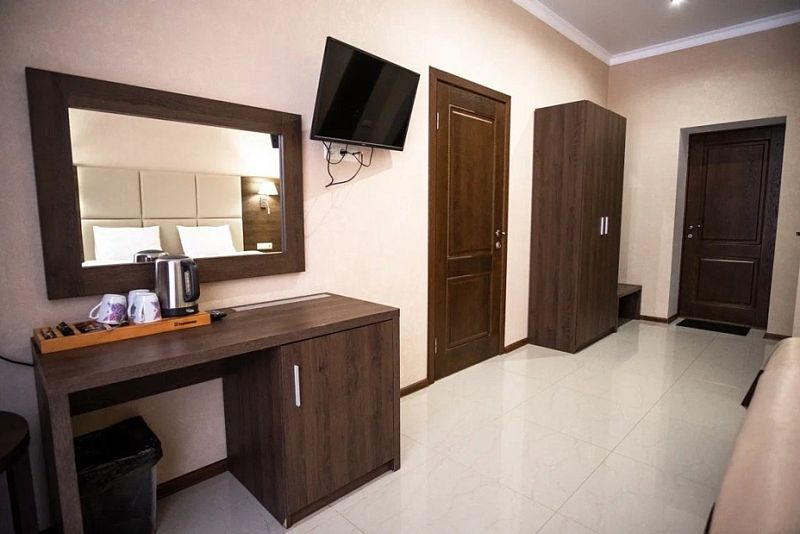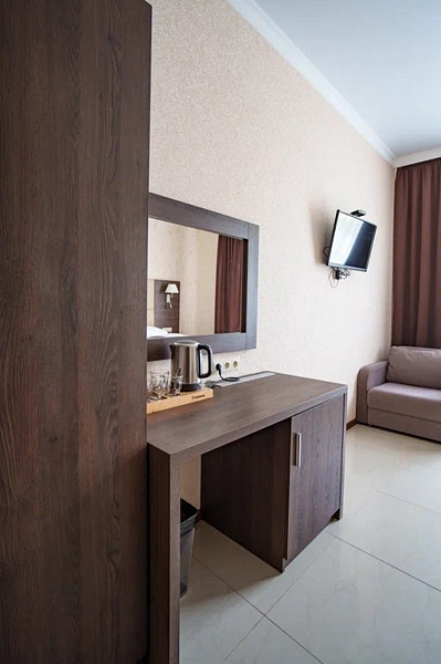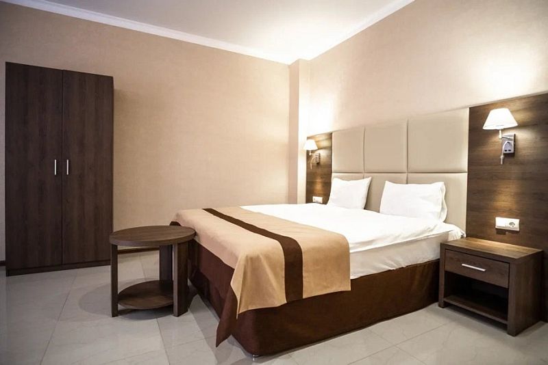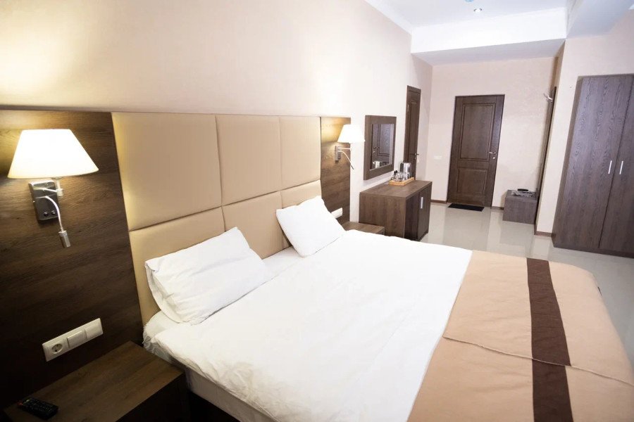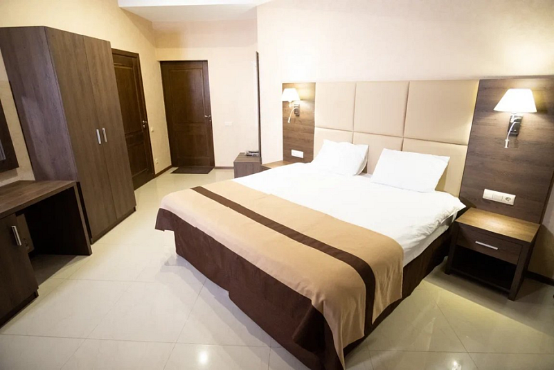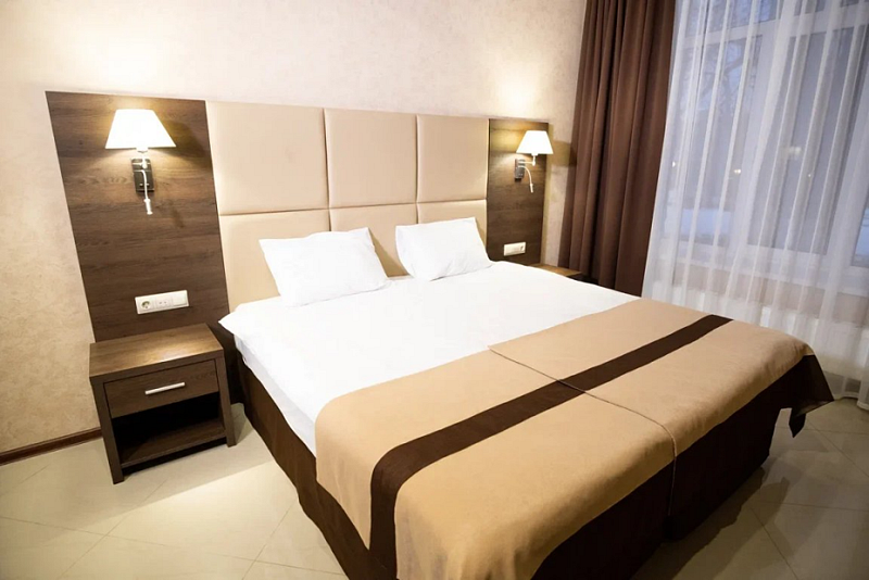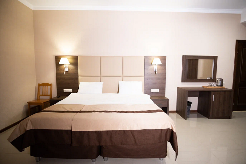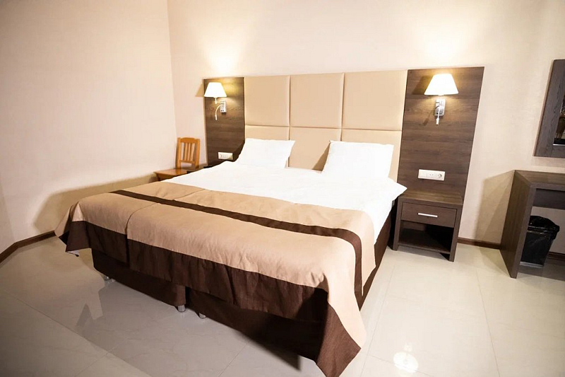 В каждом номере вы найдете: двуспальную кровать на 2 человека с возможностью разъединения, кресло-кровать или диван кровать на 1-2 человека, так же шкаф для верхней одежды, две тумбочки, светильники над кроватью для ночного чтения, трельяж с зеркалом и встроенным мини\холодильником для мелких нужд и телевизор.