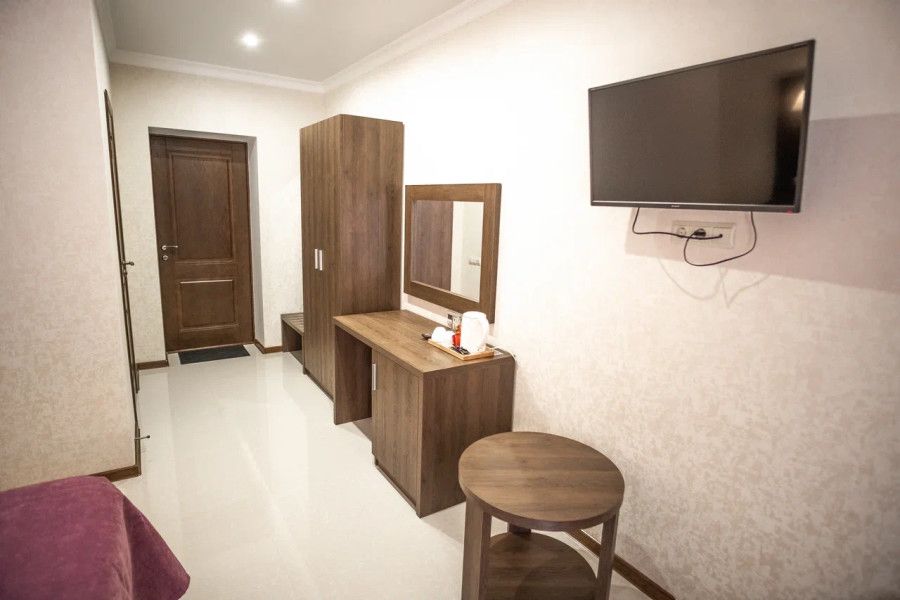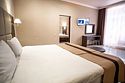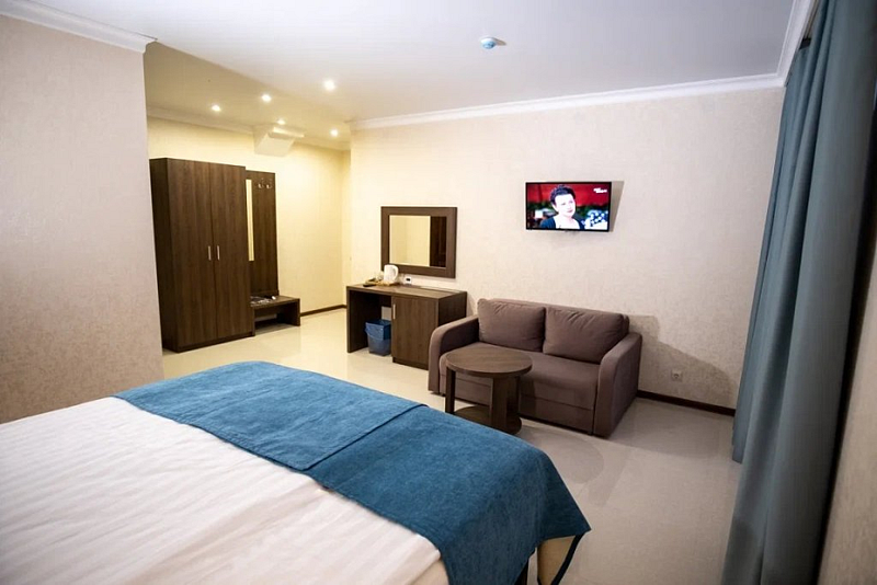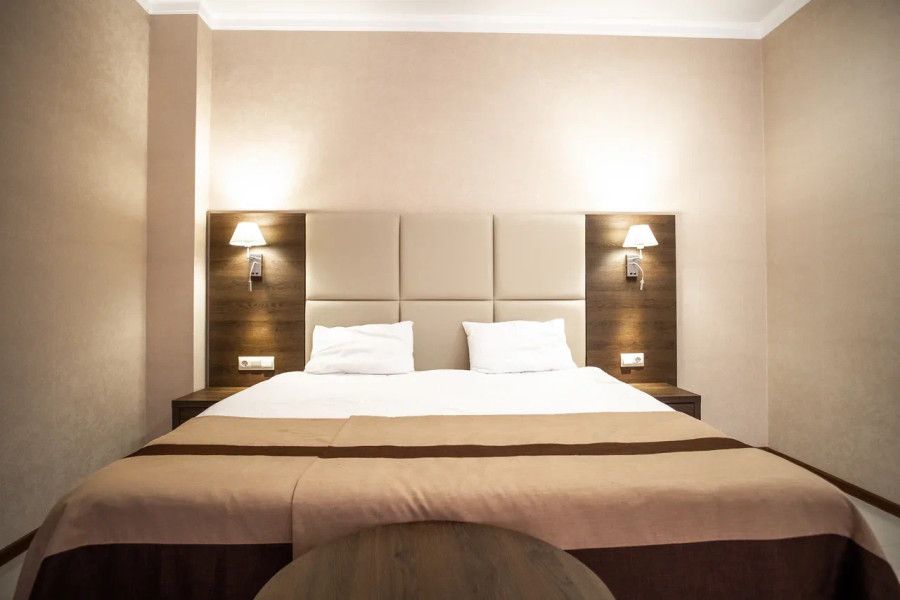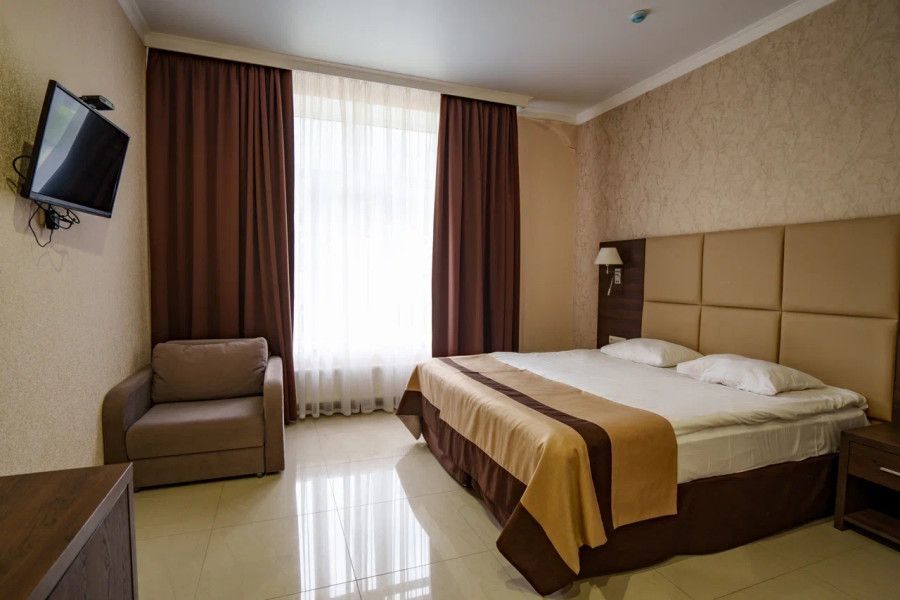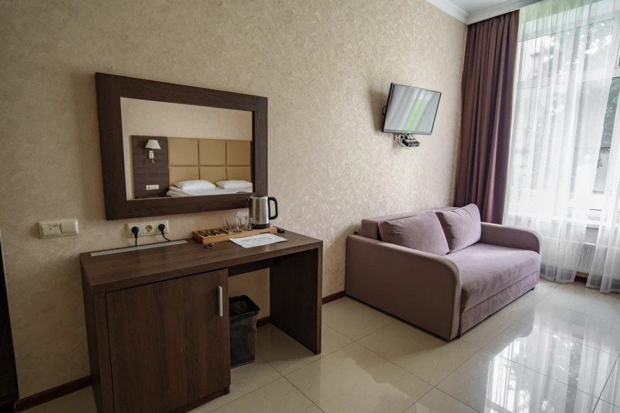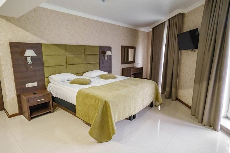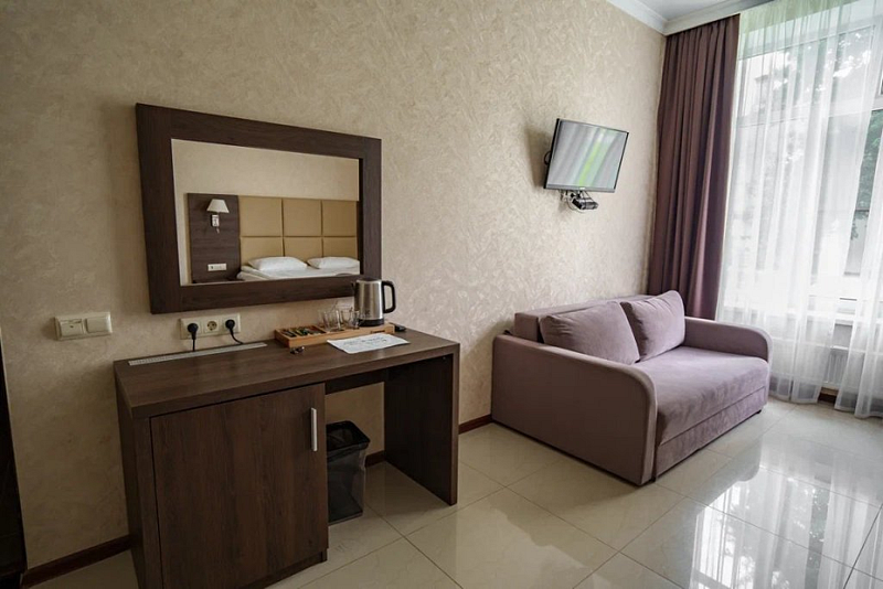 В каждом номере вы найдете: двуспальную кровать на 2 человека с возможностью разъединения, кресло-кровать или диван кровать на 1-2 человека, так же шкаф для верхней одежды, две тумбочки, светильники над кроватью для ночного чтения, трельяж с зеркалом и встроенным мини\холодильником для мелких нужд и телевизор.