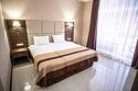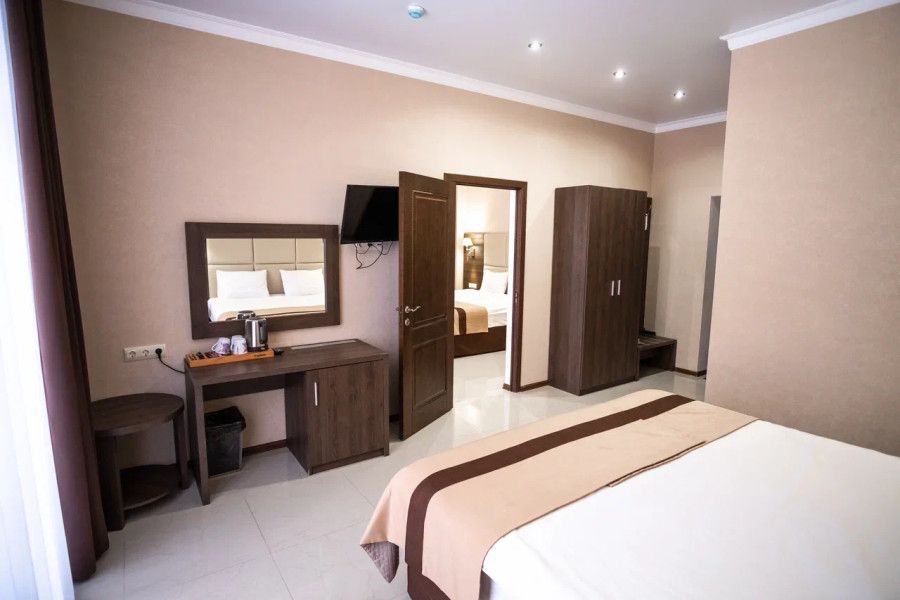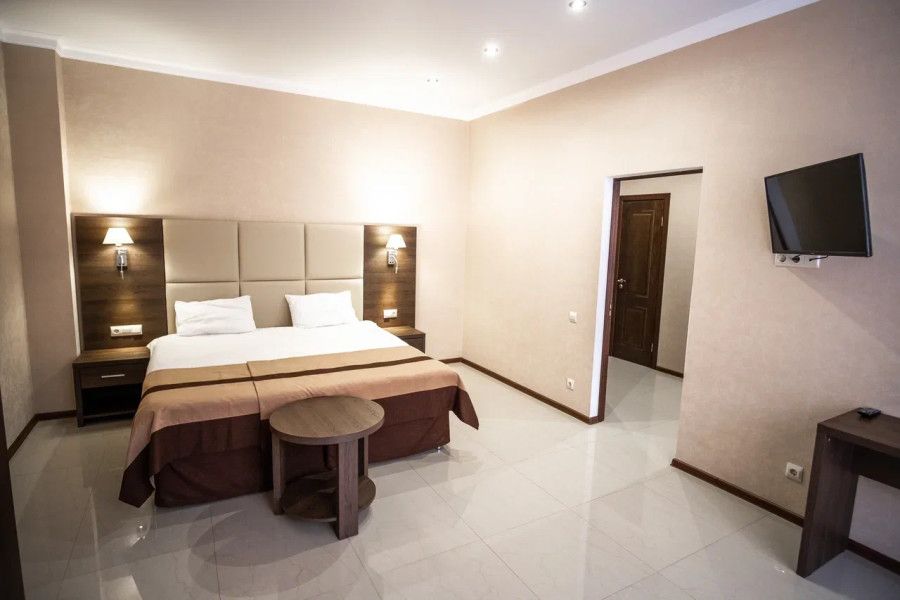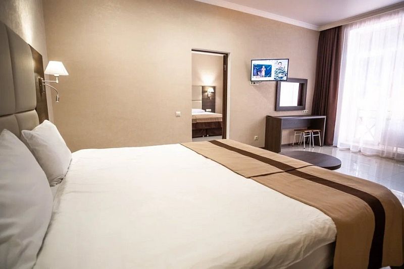 В данном номере вы найдете: две отдельные спальные комнаты с двуспальными кроватями на 2 человека с возможностью разъединения, кресло-кровать на 1-2 человека, так же шкаф для верхней одежды, по две тумбочки, светильники над кроватью для ночного чтения, трельяж с зеркалом и встроенным мини\холодильником для мелких нужд и телевизор.