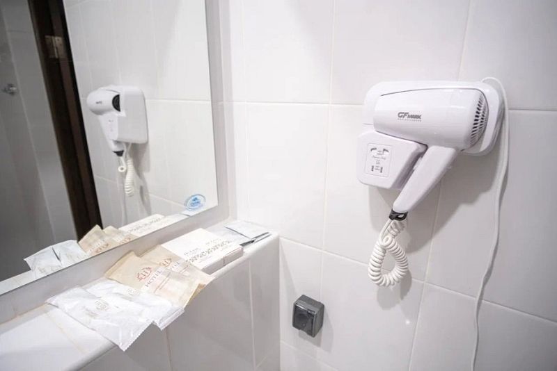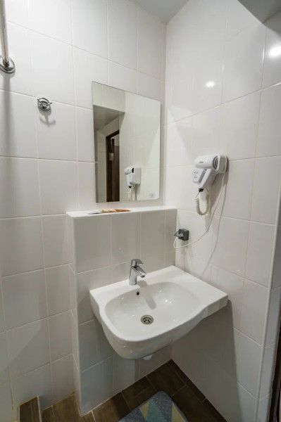 А также в номере есть: фен, тапочки, гель, шампунь, зубная щетка с пастой, мыло, кофе, чай, сахар, чашки, ложки, электрический чайник, полотенца трех типов (тело, лицо, ноги), туалетная бумага, освежитель воздуха.