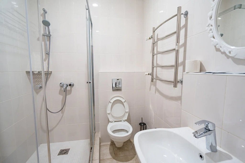 В спальне, вы найдете: двуспальную кровать на 2 человека, так же шкаф для верхней одежды, две тумбочки, светильники рядом с кроватью для ночного чтения. В гостиной зоне есть: телевизор, диван - раскладной, обеденный столик, холодильник, электрический чайник, чашки, ложки, чай, кофе, сахар.