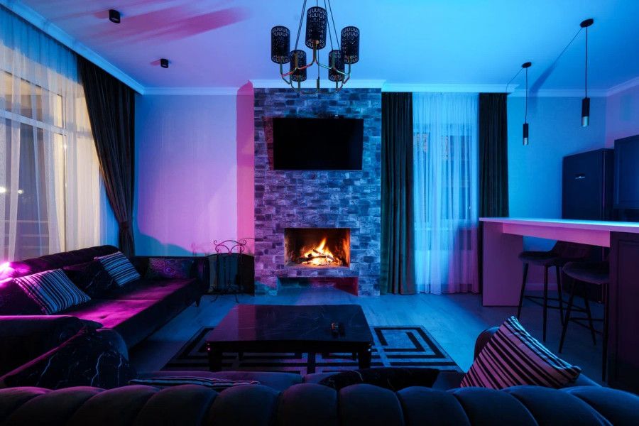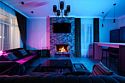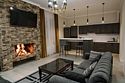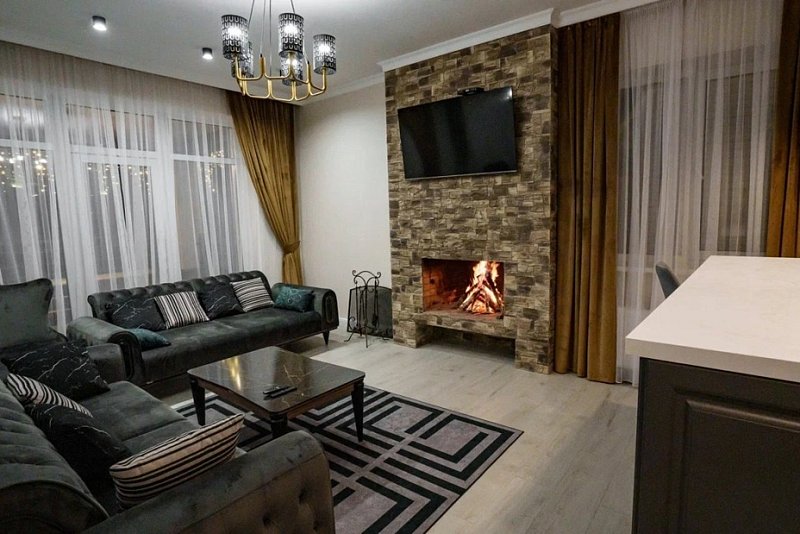 В гостиной зоне есть: телевизор, диван - раскладной, обеденный стол со стульями и настоящий камин.