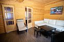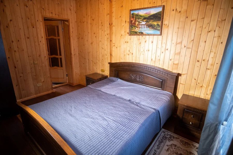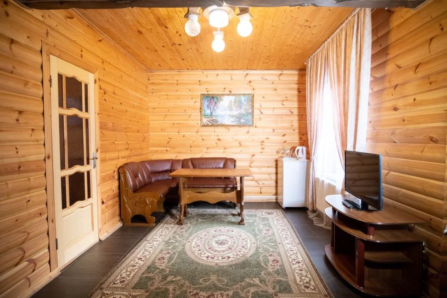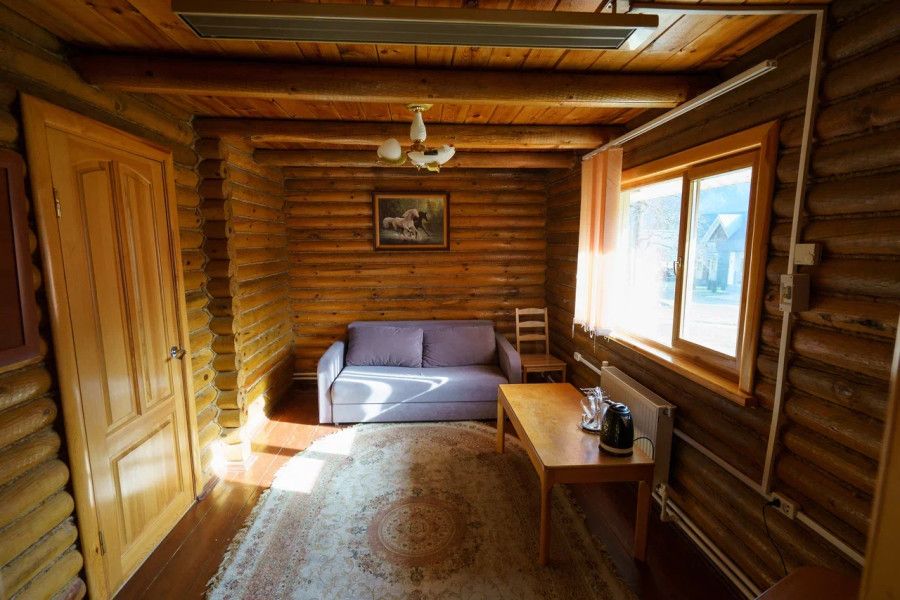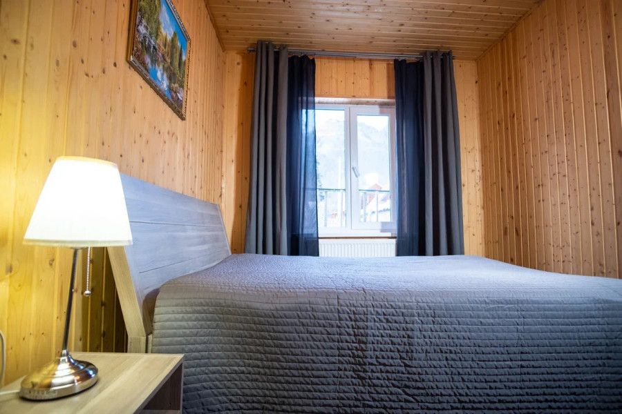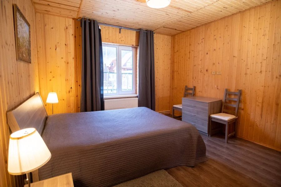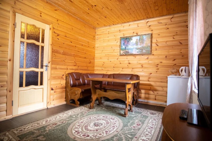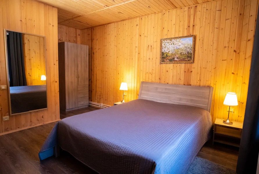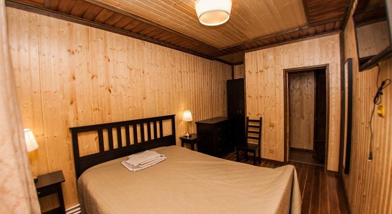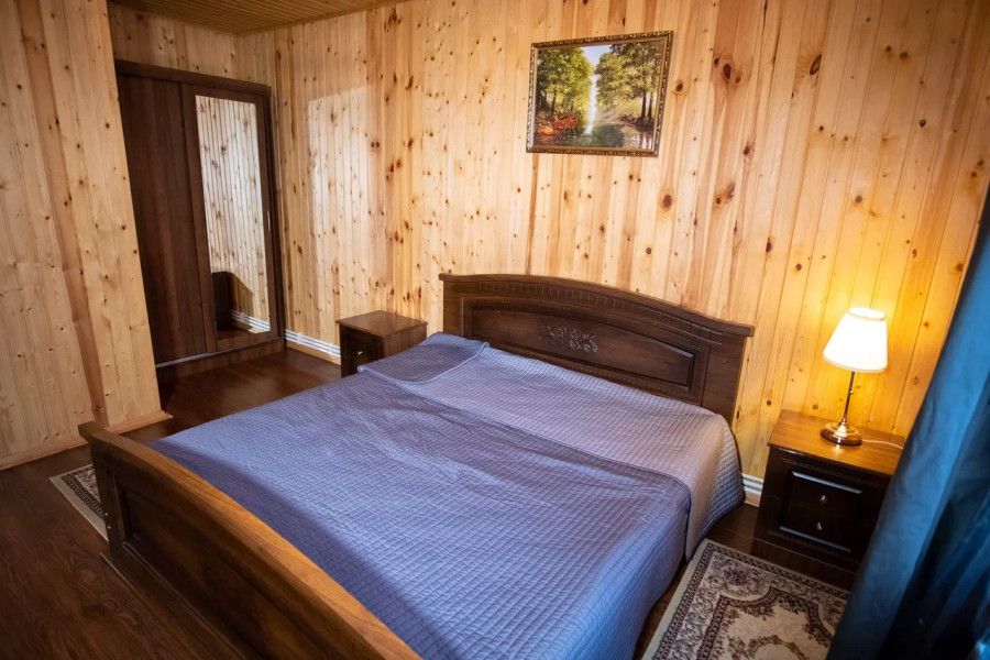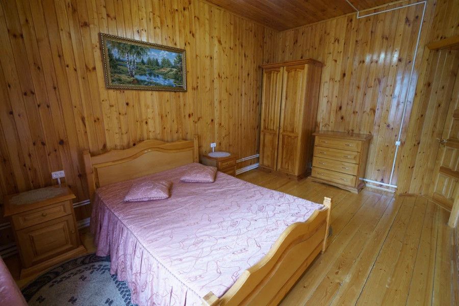 В спальне данного коттеджа вы найдете: двуспальную кровать на 2 человека, так же шкаф для верхней одежды, две тумбочки, комод для белья и принадлежностей, светильники рядом с кроватью для ночного чтения. В гостиной зоне есть: телевизор, большой диван раскладной, кухонная гарнитура, вся необходимая посуда, варочная панель на 4 конфорки, обеденный стол, холодильник, микроволновка, электрический чайник, чай, кофе, сахар, все необходимые чистящие средства.