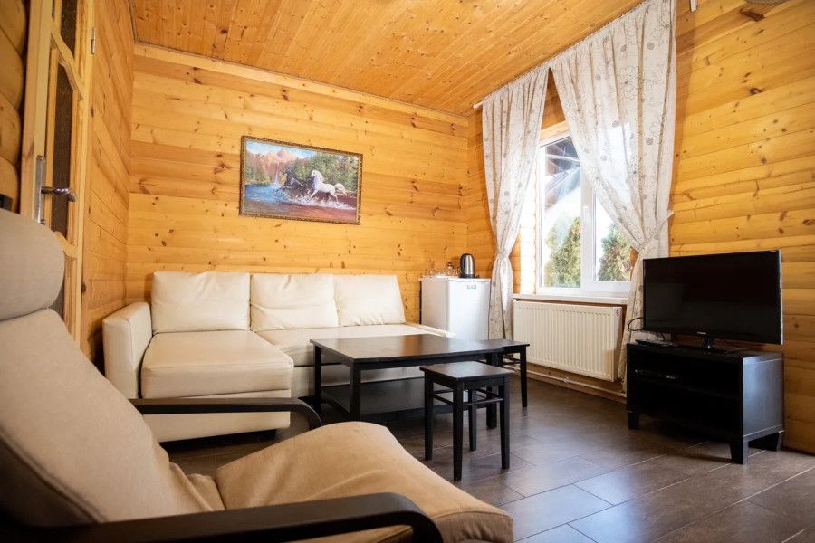 Короткий отпуск с друзьямиУютное Орлиное ГнездоОтдыхали в Орлином Гнезде компанией в 8 человек. Территория огорожена забором, очень много сделано для детей, тут и качели и домик на дереве. У каждого домика есть своя небольшая беседка с мангалом. Сам домик внутри оказался гораздо больше, чем показалось снаружи. В гостиной большой диван и камин. Уютные и просторные комнаты. Удобные кровати, свежее постельное белье и полотенца добавили уюта. Есть только пара замечаний, не хватало губок для мытья посуды и таких мелочей как чай/кофе. Понимаю, что это не обязательный атрибут, но показывает гостеприимность.