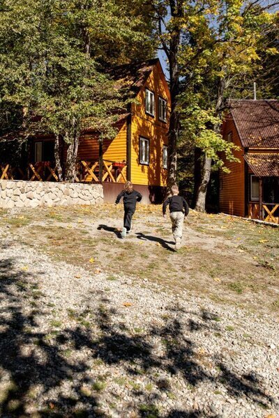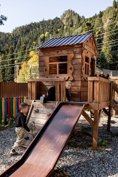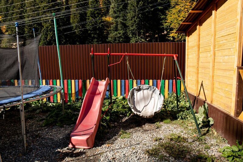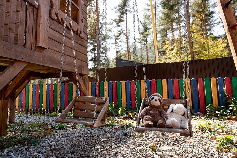 Для семей с детьми предусмотрена огражденная детская площадка с горками, качелями и батутом. Здесь дети смогут весело проводить время и создавать незабываемые моменты на свежем воздухе, а родители — насладиться уединением и красотой окружающей природы.