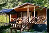 Шале одноэтажное 45 кв. Две раздельные спальни. В одной спальне двухспальная кровать, в другой две односпальные. Гостиная с раскладным диваном. 4 основных и 2 доп места в качестве раскладного дивана. Один санузел.