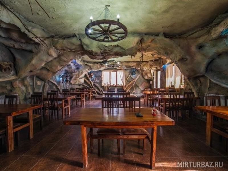 База рассчитана на 80 человек и предоставляет круглогодичный отдых в комфортабельных номерах со всеми условиями. Большая часть номеров и домиков построены из цельного хвойного бруса. На базе есть кафе в стиле пещеры со своей кухней и всеми принадлежностями для приготовления пищи. На территории базы оборудовано барбекю зона с мангалами, котлами и всем необходимым для приготовления мяса. Имеются беседки разных размеров как для больших компаний, так и для небольшой семьи. Также на территории есть русская баня с бассейном.
