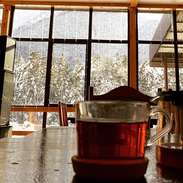 Есть особое наслаждение завтракать на открытом воздухе с прекрасным видом на горы. Вас обеспечат пледами, поэтому разговоры на свежем воздухе за чаем пройдут особенно приятно.