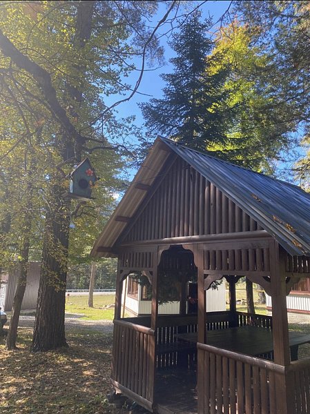 На веранду проведено электричество — гаджеты можно зарядить прямо на месте. В темное время суток в беседке включается свет.