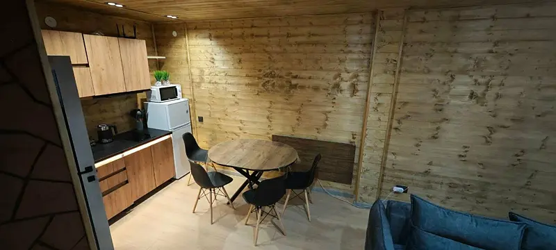 Каждый коттедж рассчитан на проживание 6 человек: кухня-гостиная, изолированные 2 спальни, 2 санузла.
